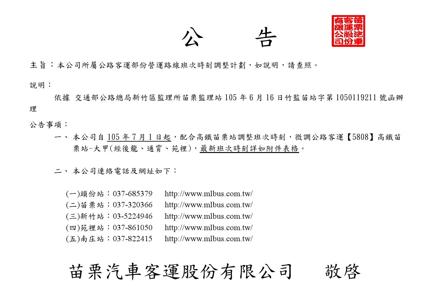 公路客運最新班次時刻表調整說明(105年7月1日起實施)