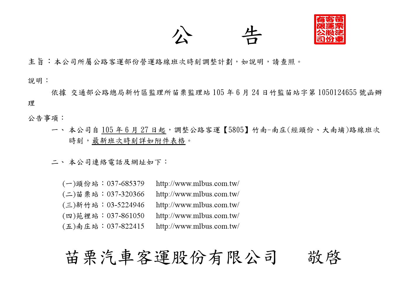 公路客運最新班次時刻表調整說明(105年6月27日起實施)