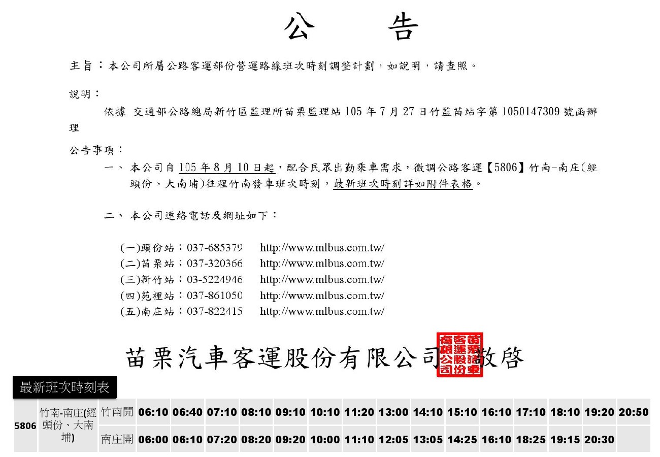 公路客運最新班次時刻表調整說明(105年8月10日起實施)