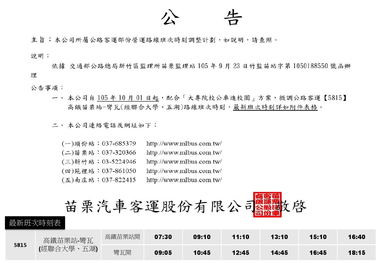 【5815】路線班次時刻調整(105年10月01日起實施)