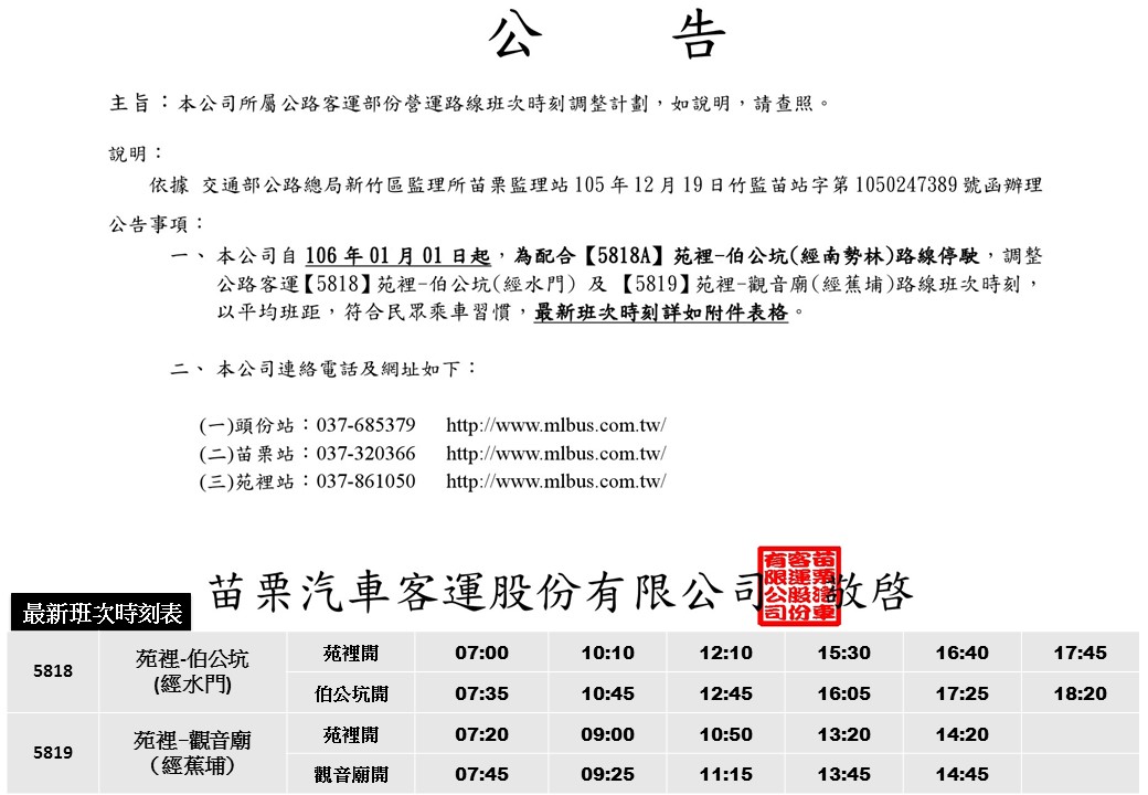 【5818、5819】班次時刻調整(106年1月1日起實施)