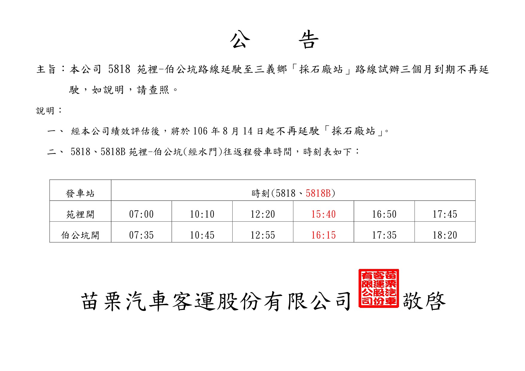 5818苑裡-伯公坑延駛「採石廠站」到期不再延駛公告