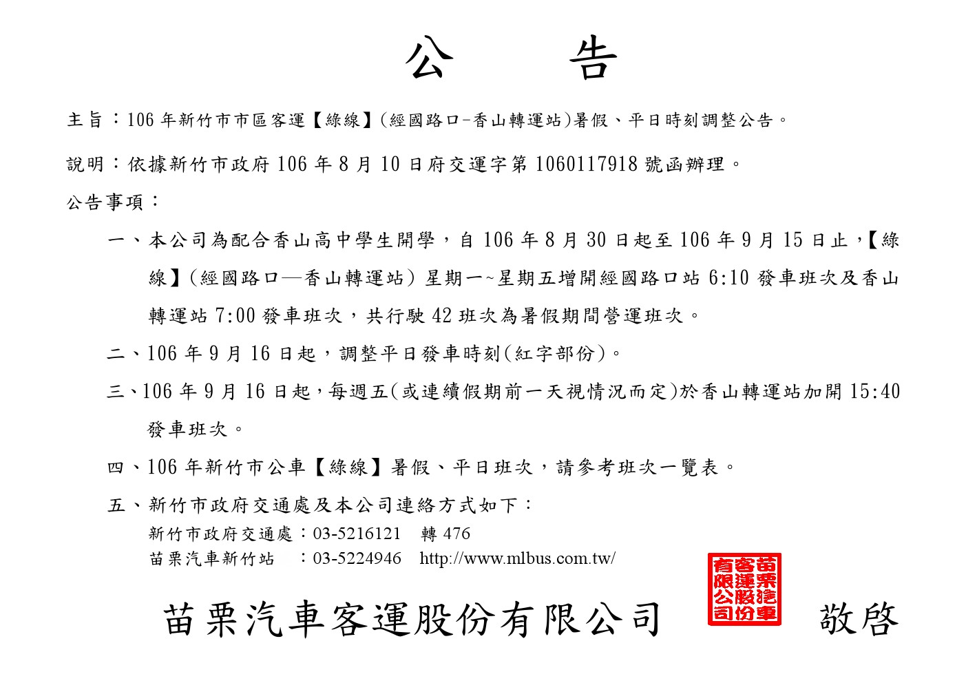 106年度【新竹市區公車綠線】暑假、平日調整時刻公告