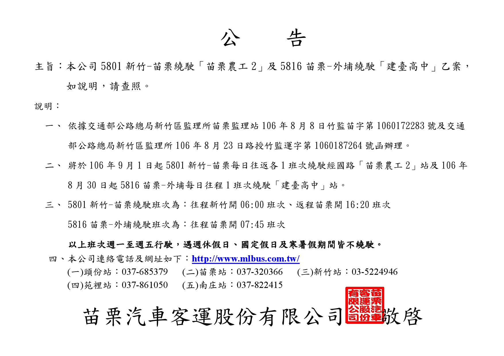 本公司部分路線班次繞駛【苗栗農工2】及【建臺高中】公告