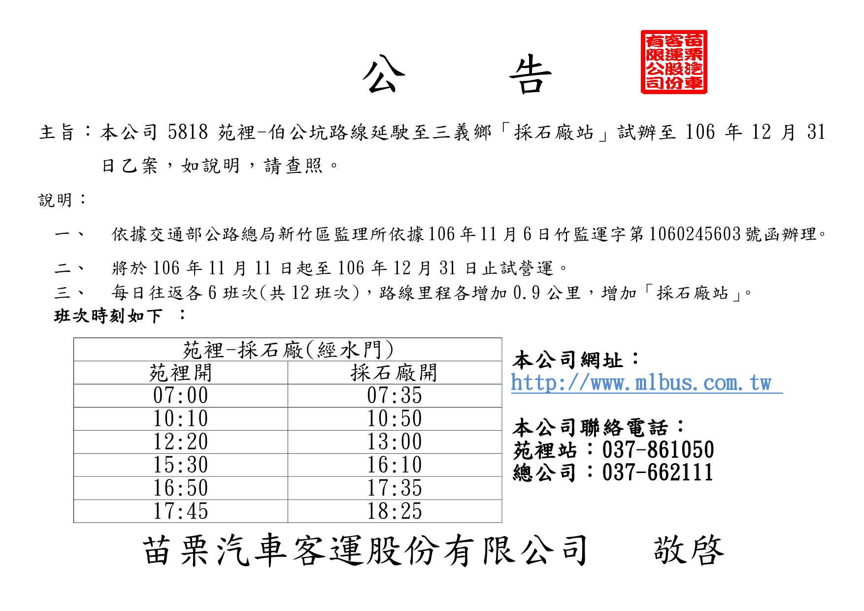 5818苑裡-伯公坑延駛至「採石廠」試辦公告