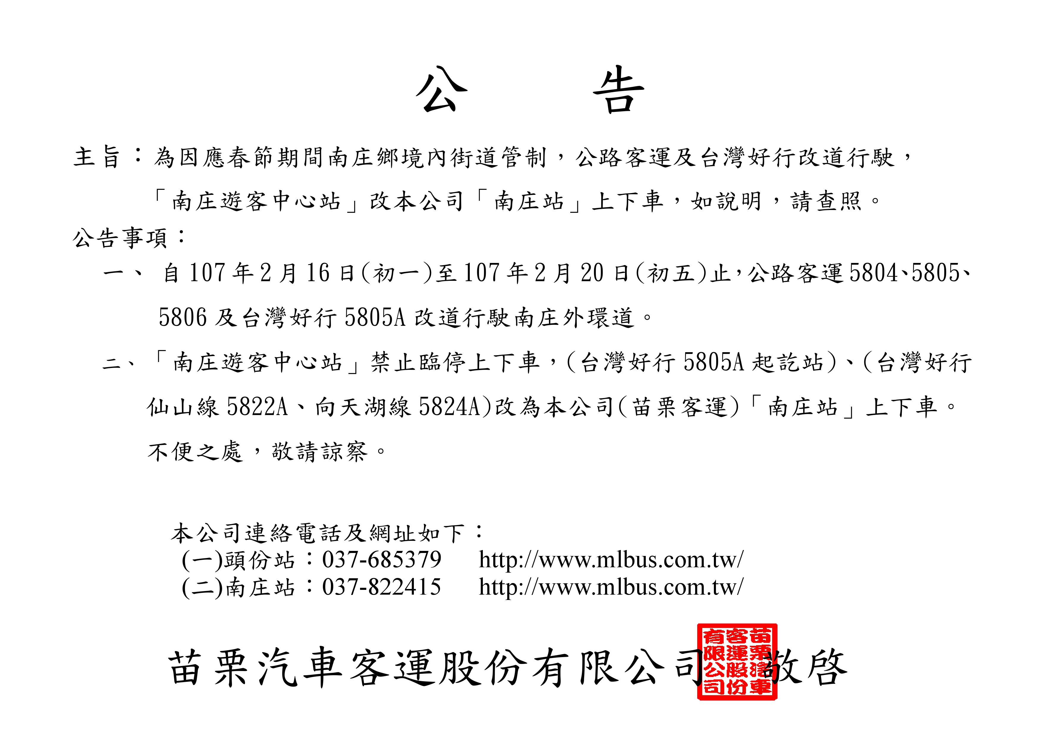 「107年春節連續假期南庄地區交通管制」說明公告