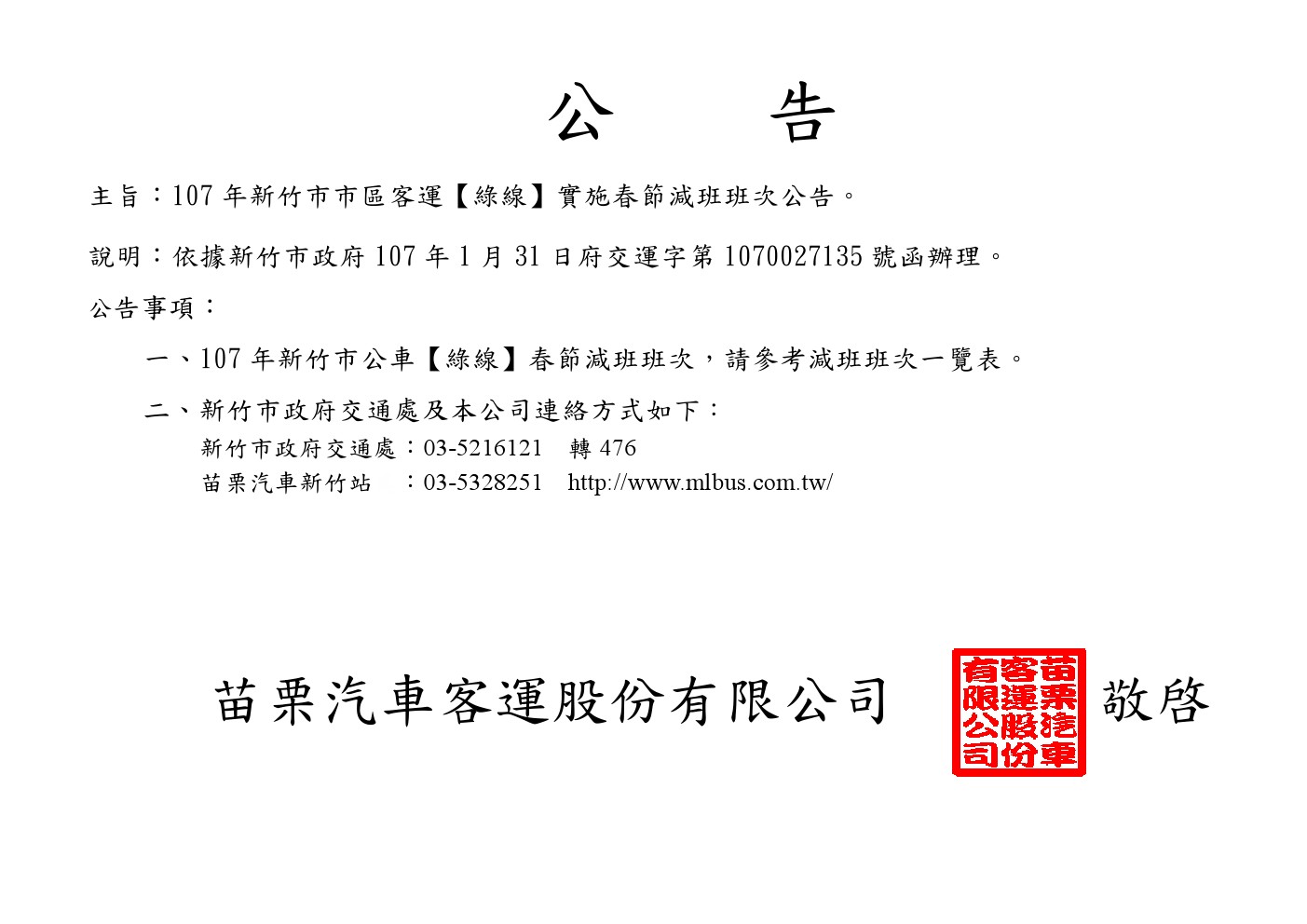 107年度【新竹市區公車-綠線】春節減班公告