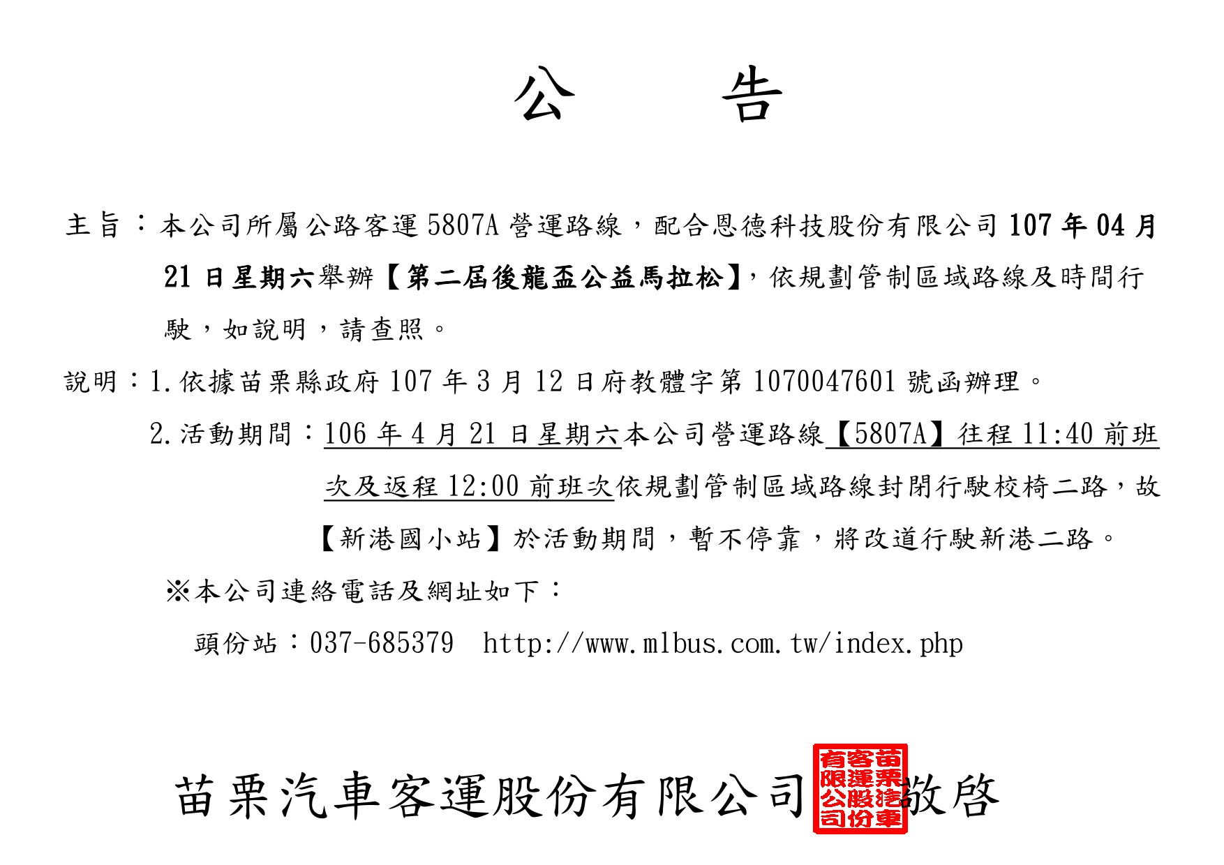【2018第二屆後龍盃公益馬拉松活動】影響站點公告