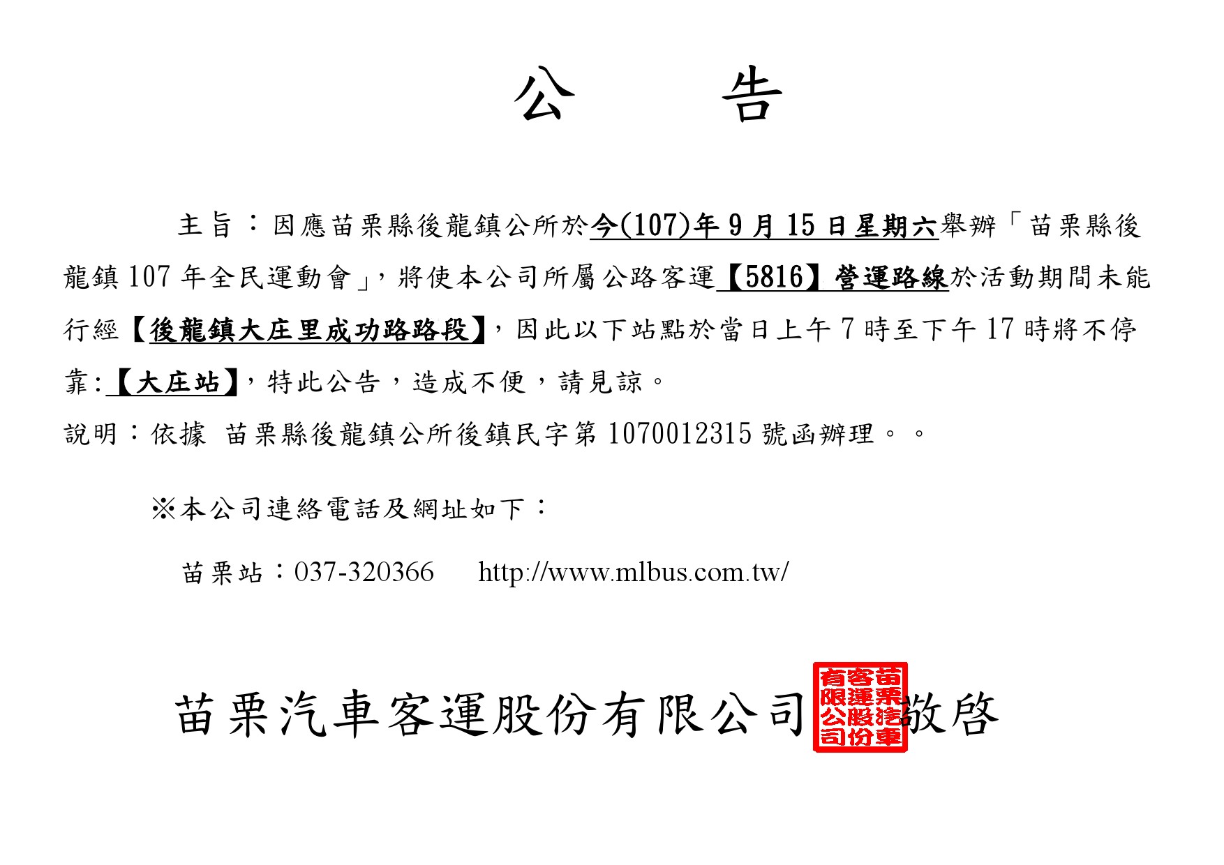 【5816】苗栗一外埔(經後龍、高鐵苗栗站),班車改道通知。