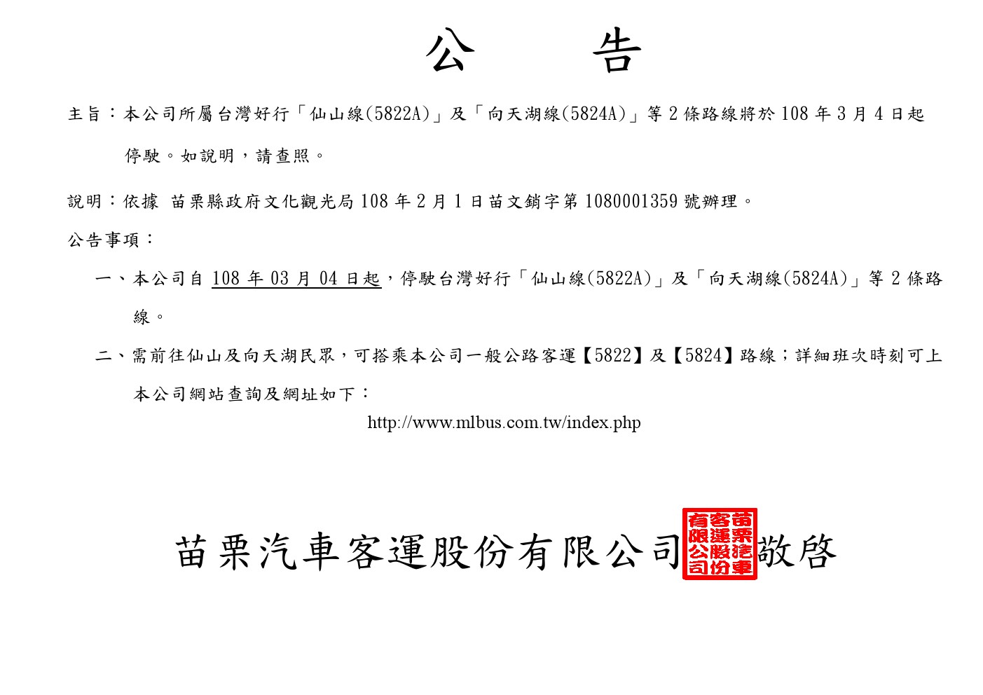 台灣好行「仙山線(5822A)及向天湖線(5824A)」停駛