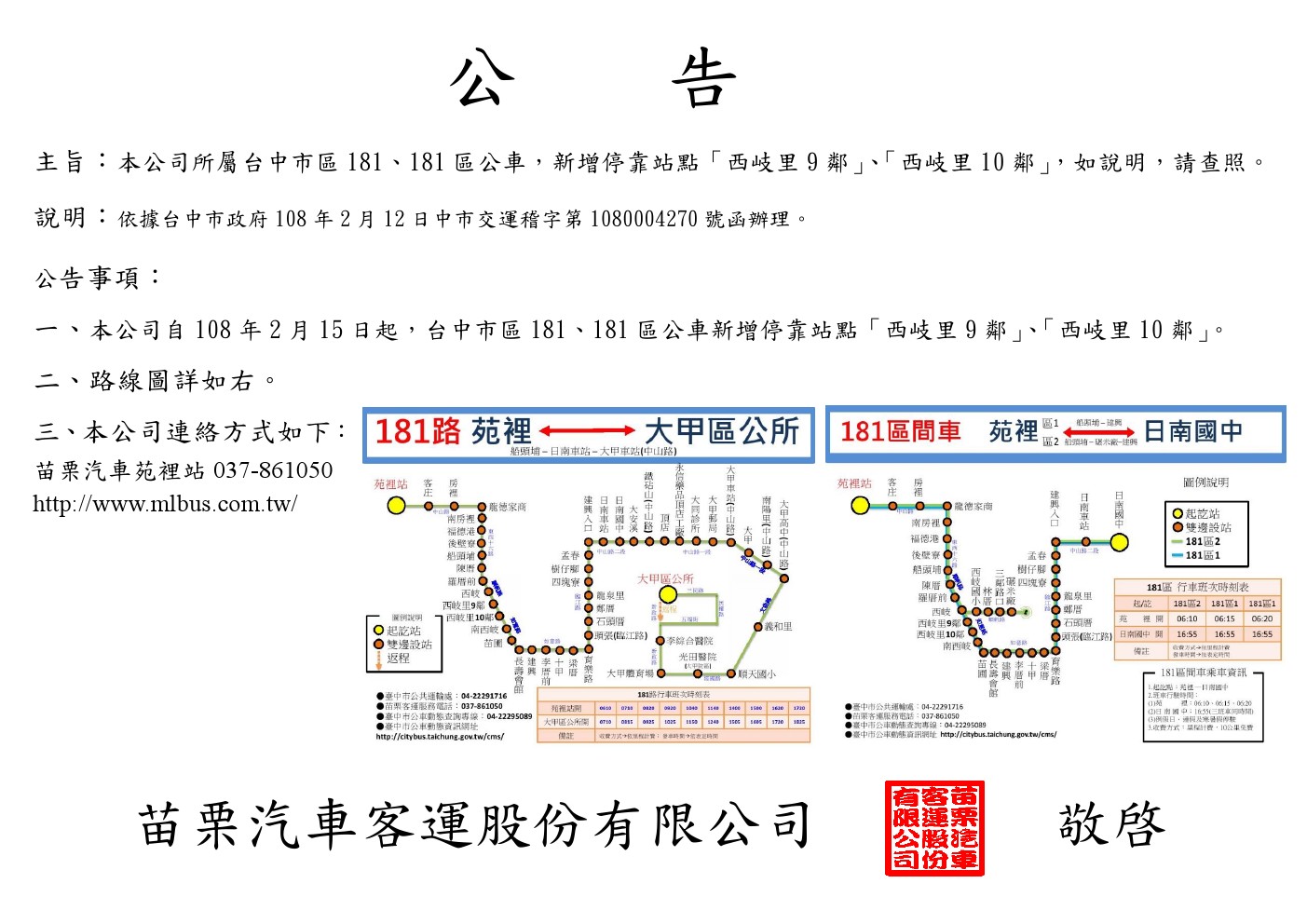 台中市公車181、181區新增「西岐里9鄰、西岐里10鄰」站