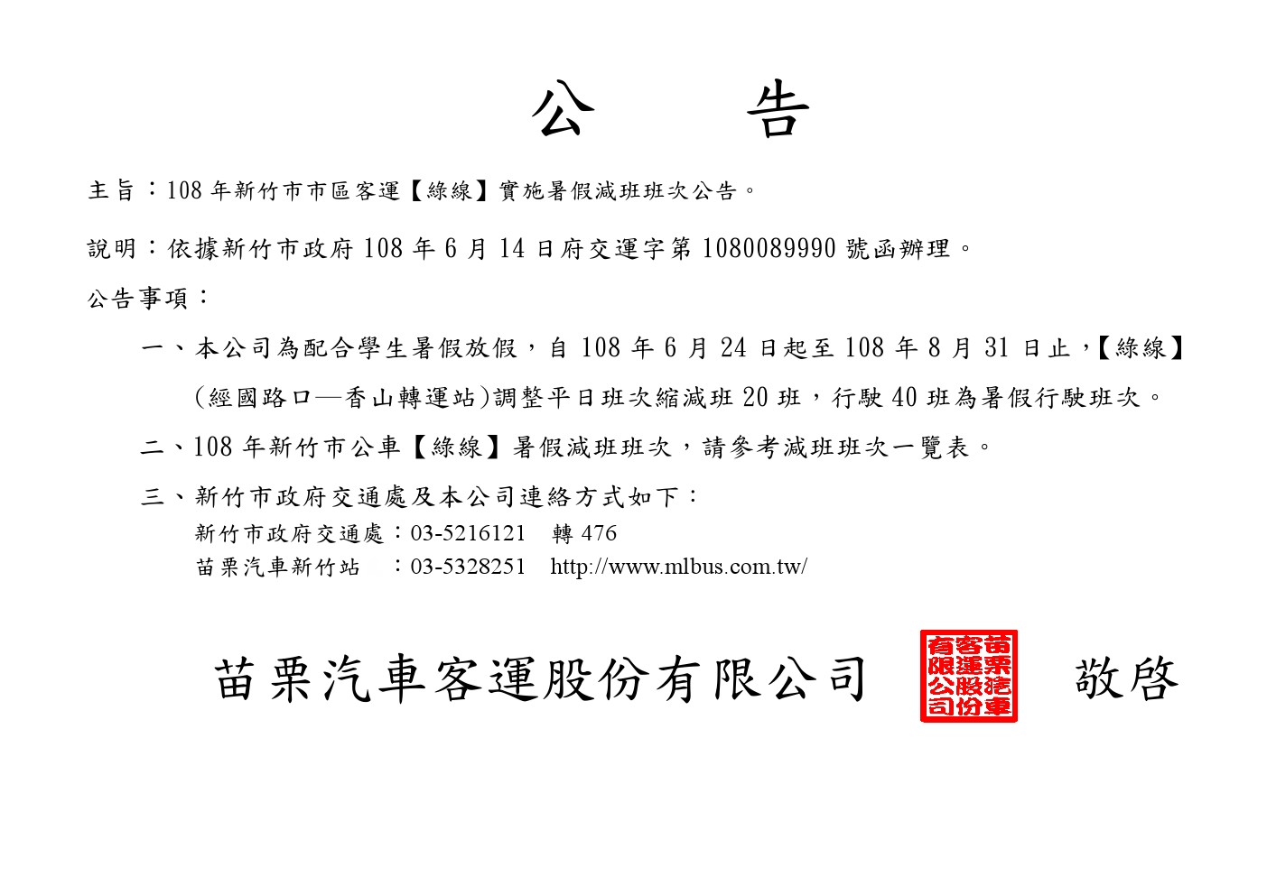 108年度【新竹市區公車綠線】暑假調整班次時刻公告