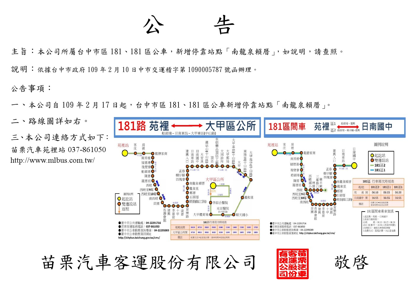 台中市公車181(含區1、區2)新增停靠-南龍泉賴厝