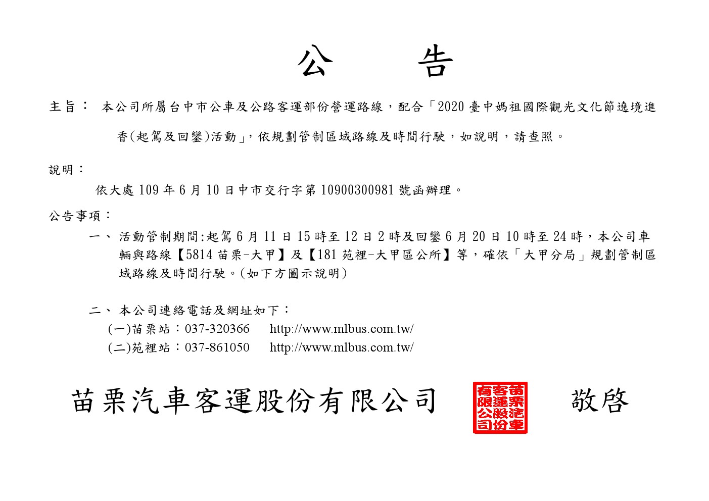 【2020年臺中媽祖國際觀光文化節遶境進香活動】路線調整通知