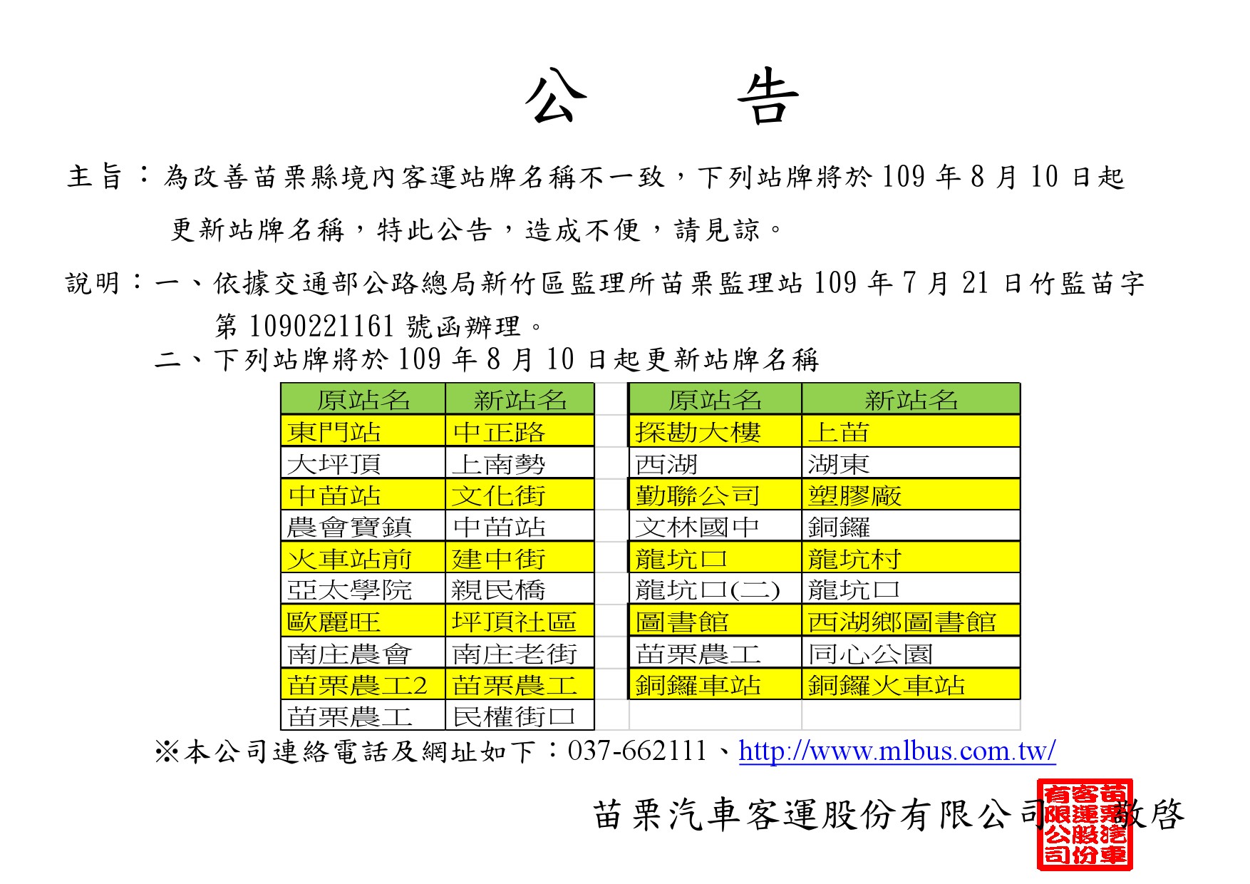 為改善苗栗縣境內客運站牌名稱不一致,部份站名變更公告