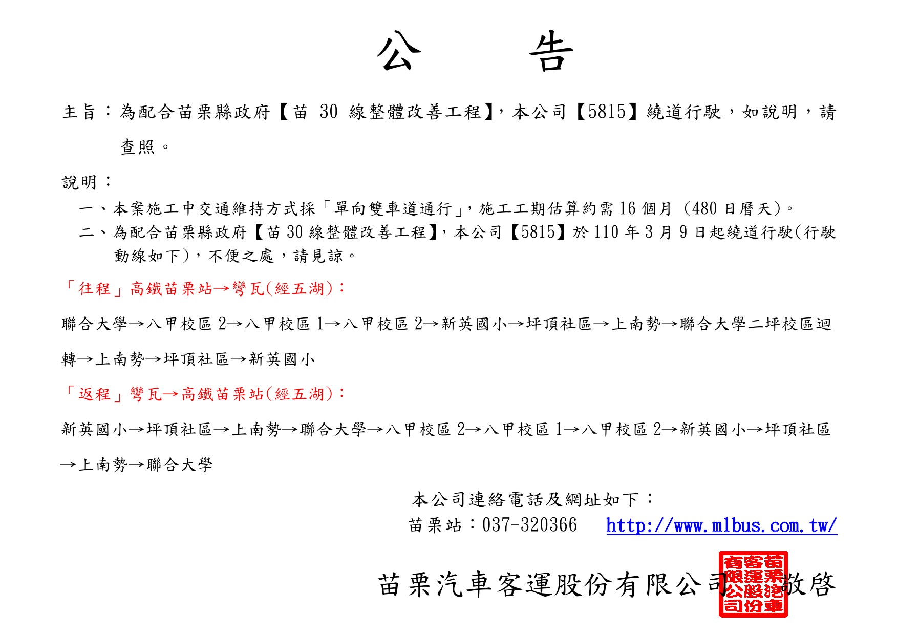 配合苗栗縣政府【苗30線整體改善工程】,【5815】繞道行駛