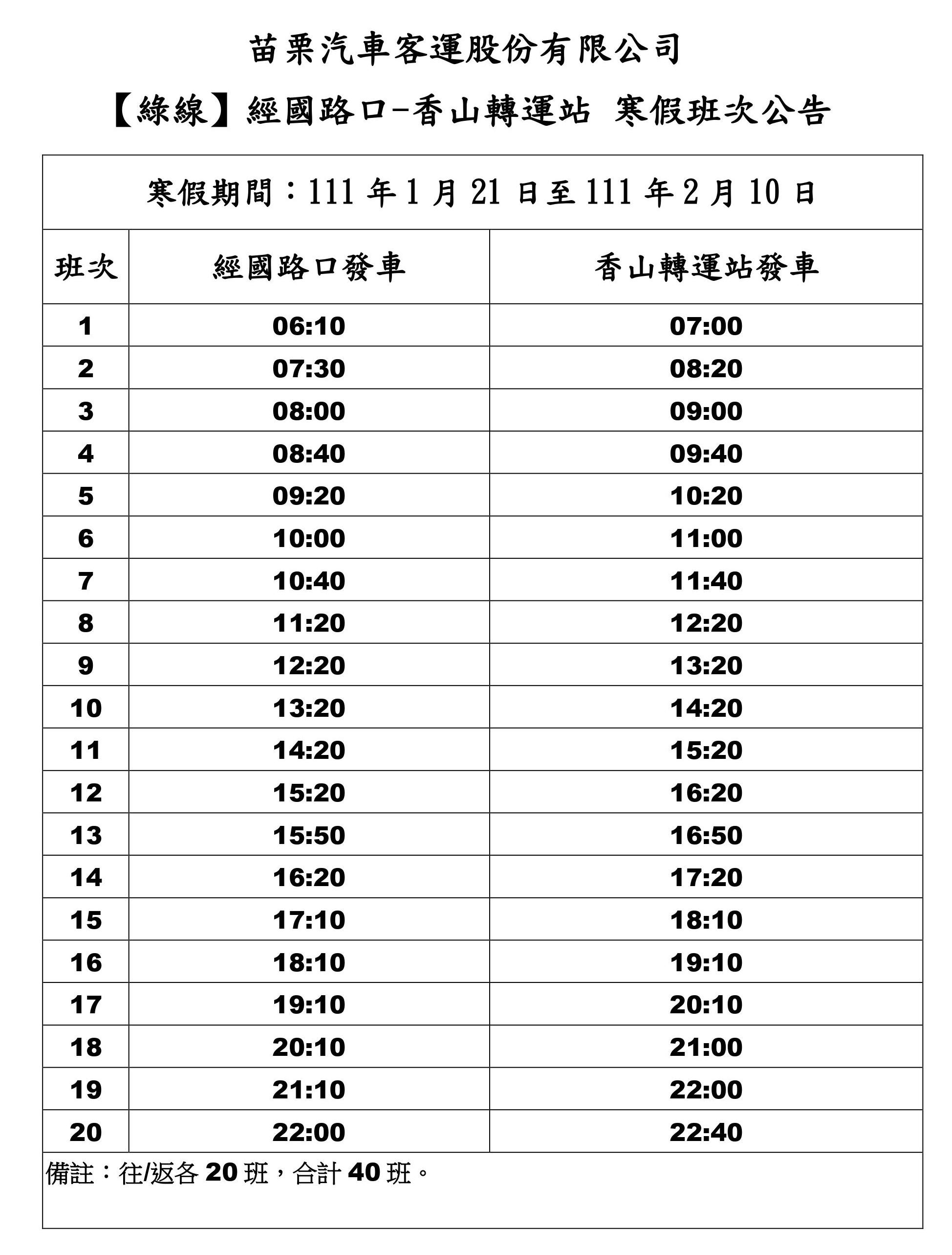 111年度【新竹市區公車綠線】寒假調整班次時刻公告