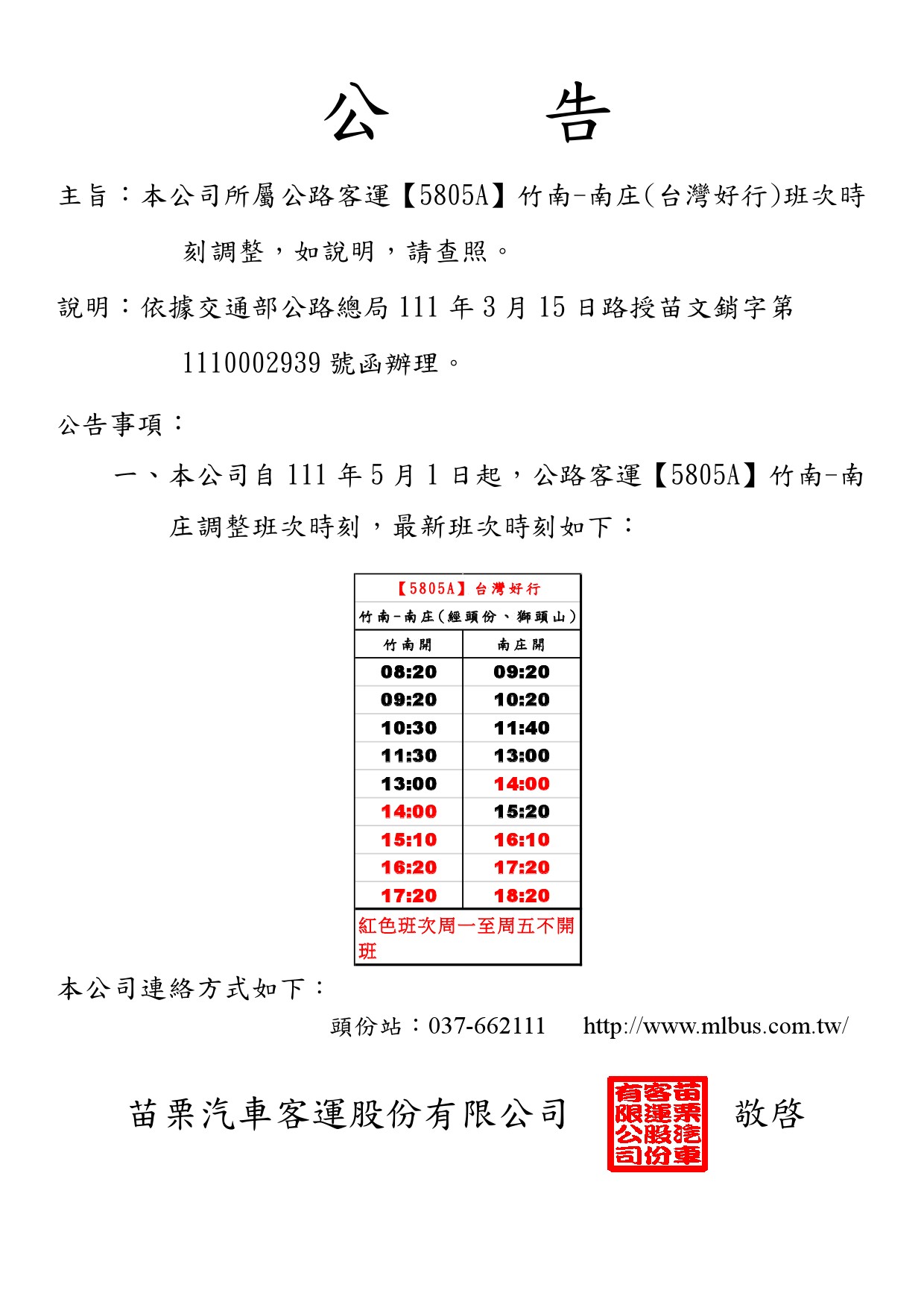 【5805A】台灣好行路線111年5月1日起班次時刻調整