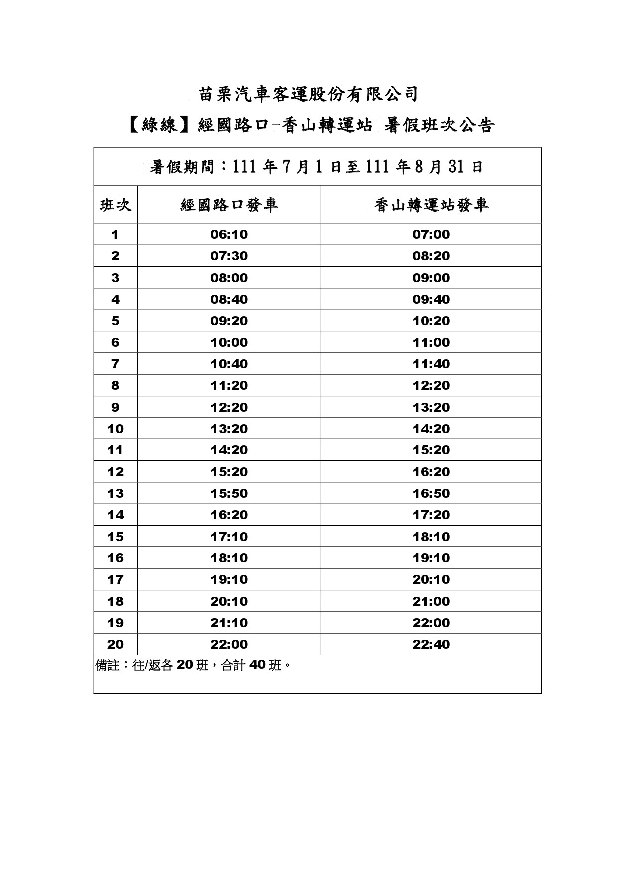 111年度【新竹市區公車綠線】暑假調整班次時刻公告
