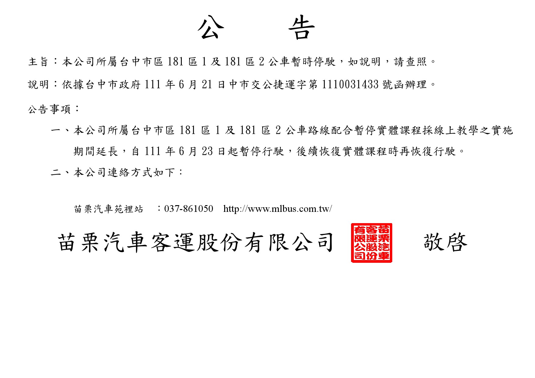 本公司所屬台中市區181區1及181區2公車暫時停駛