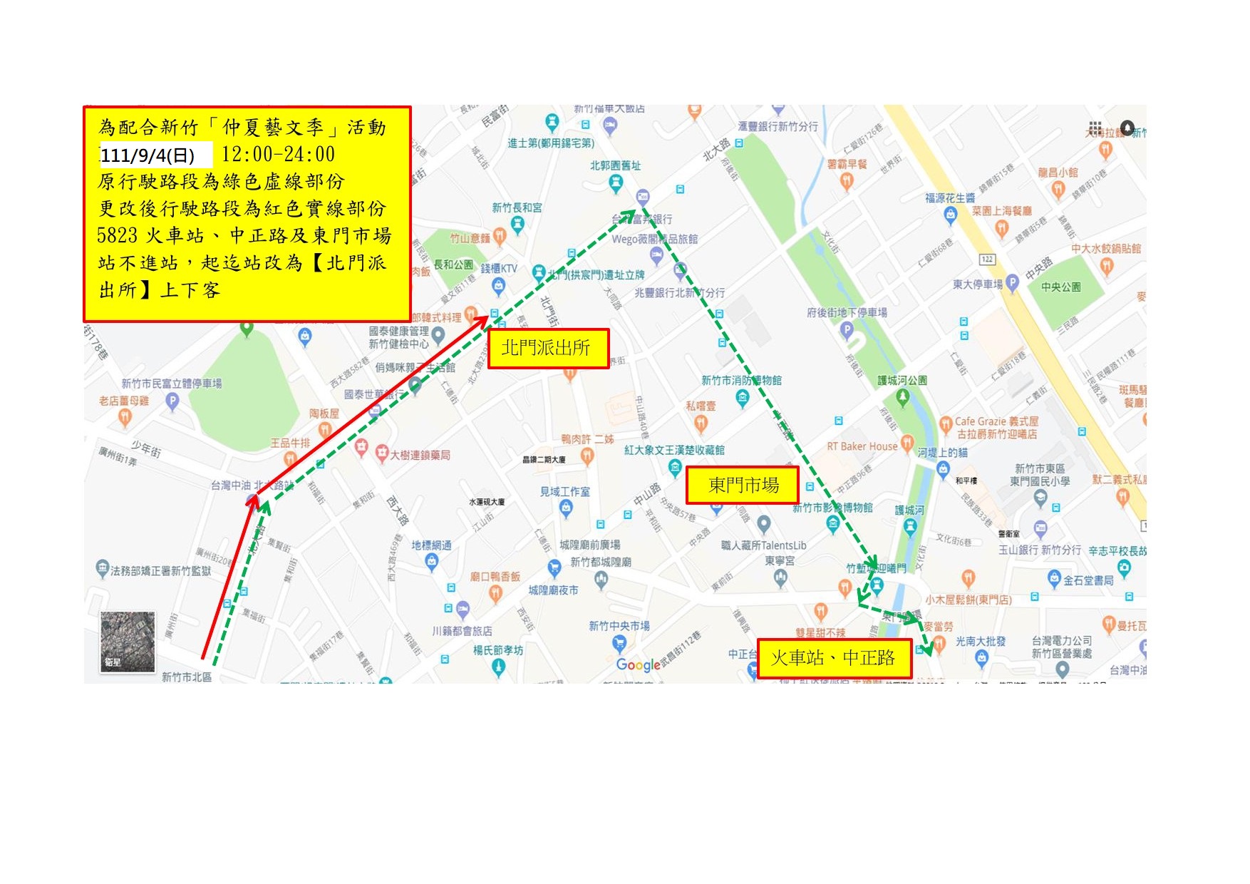 為配合新竹「仲夏藝文季」活動111/9/4(日) 5823路線往程新竹發車17:30班次改為北門派出所發車,返程竹南發車16:00行駛至北門派出所止,火車站、中正路及東門市場站不進站,起迄站改為【北門派出所】上下客,造成不便請見諒。