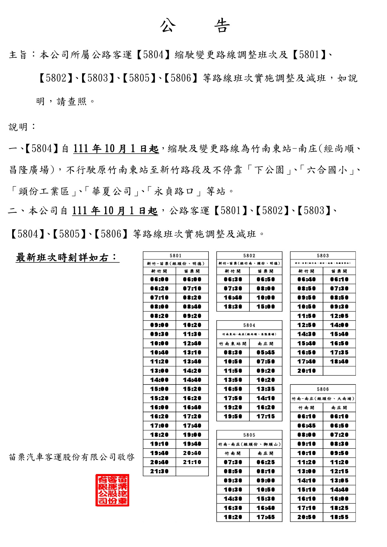 111101起5804縮駛變更暨6條路線實施減班調整時刻