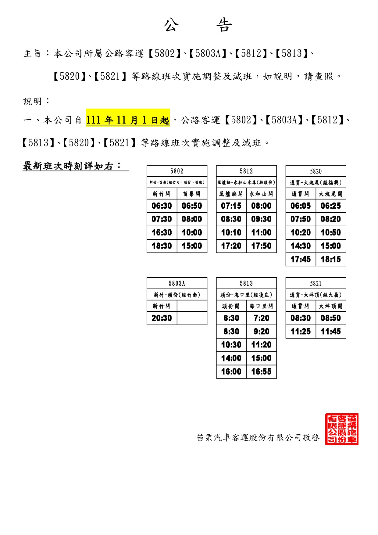 111年11月1日起本公司六條路線實施減班及調整時刻