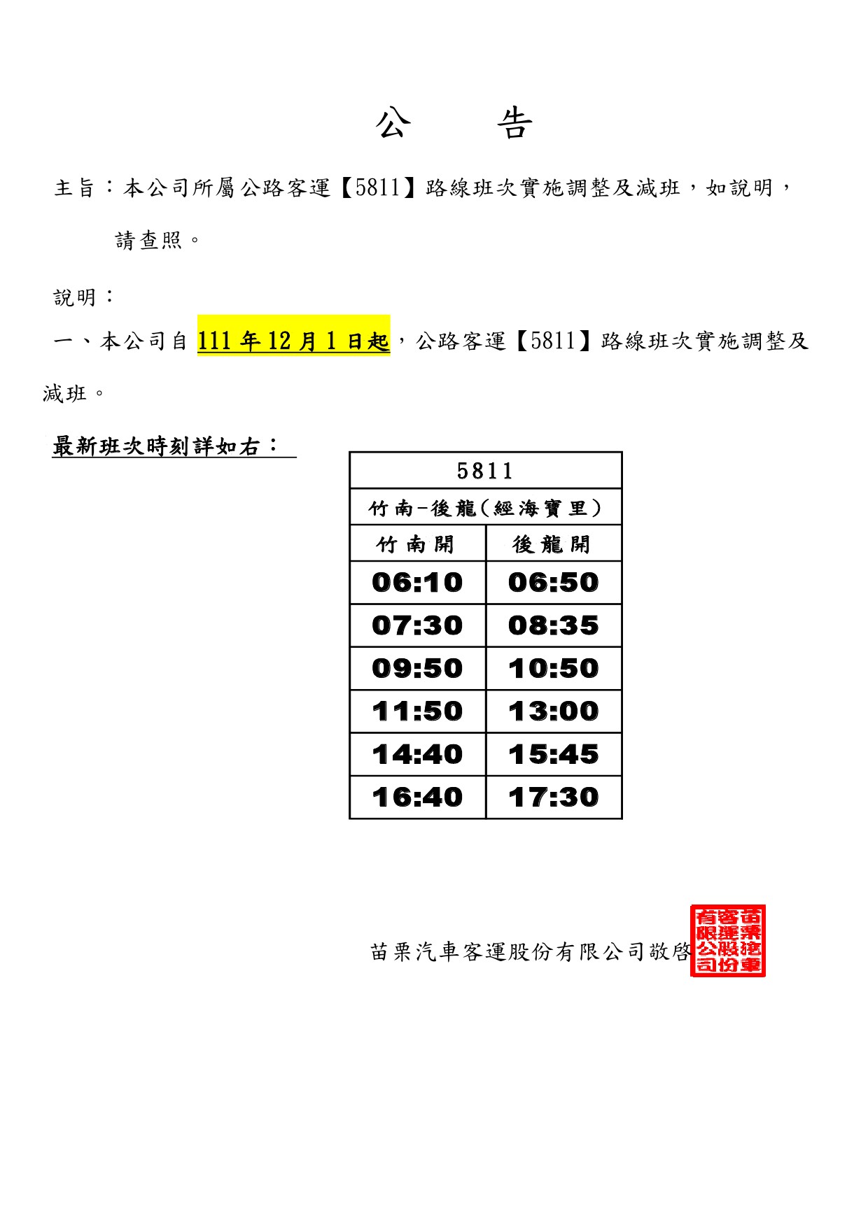 111年12月1日起本公司5811路線實施減班及調整時刻