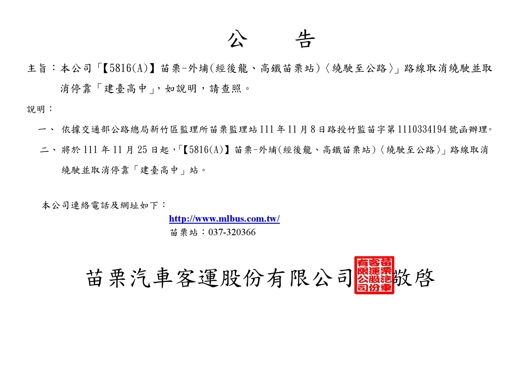 111.11.25起5816(A)取消繞駛不停靠「建臺高中」