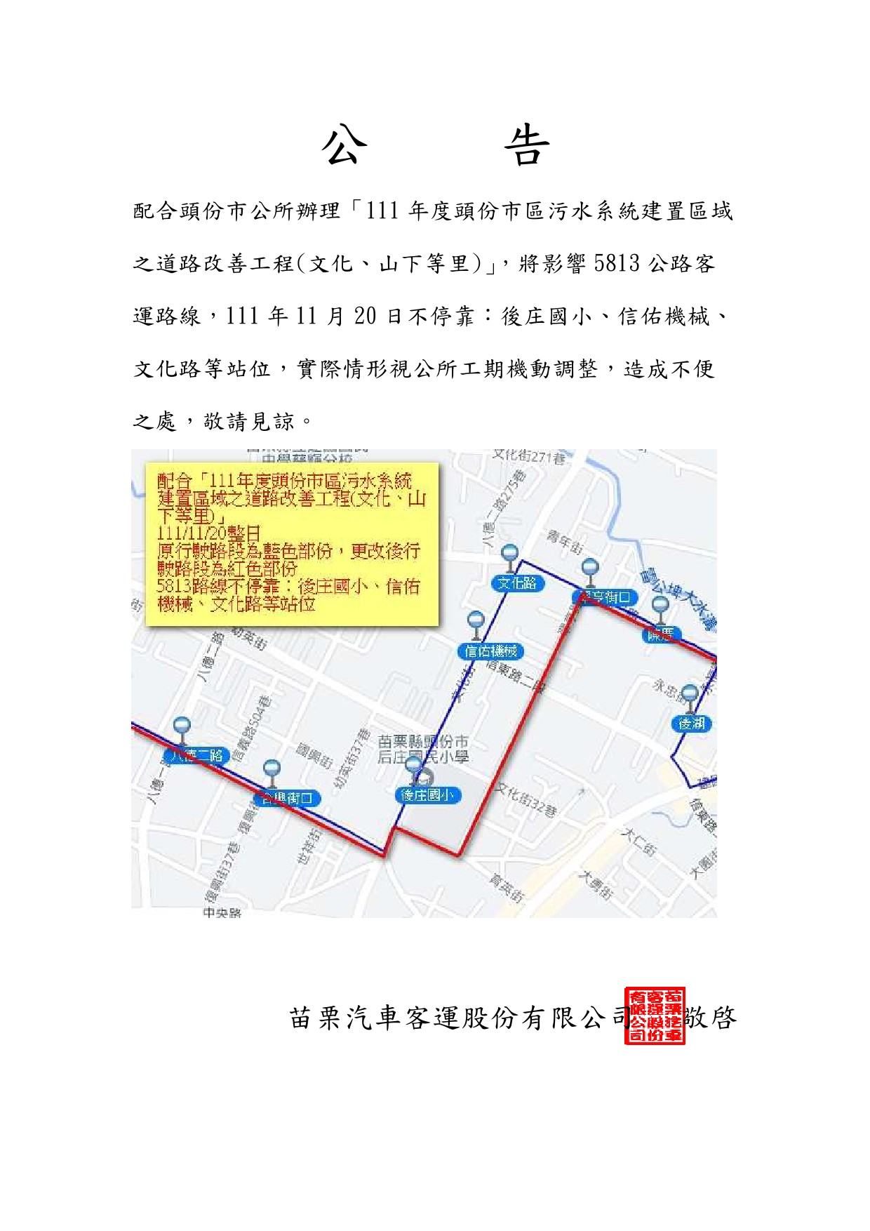 為配合道路改善工程,本公司5813路線改道行駛