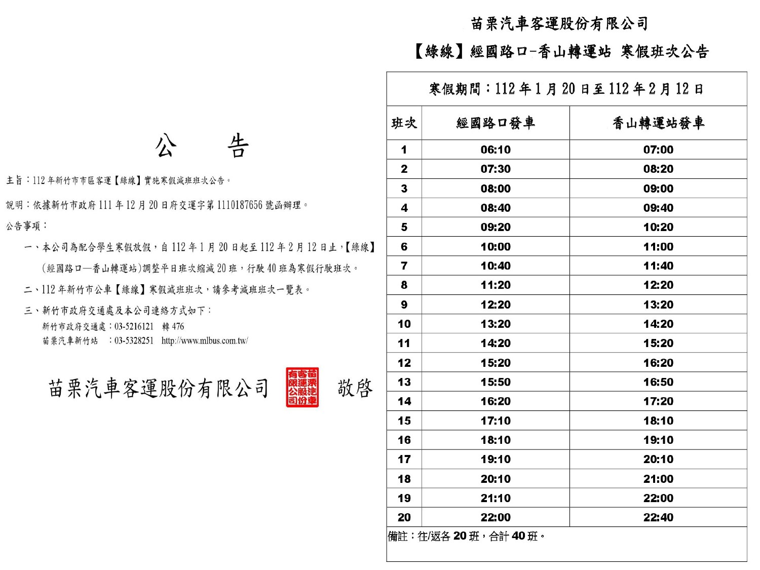 112年度【新竹市區公車綠線】寒假調整班次時刻公告
