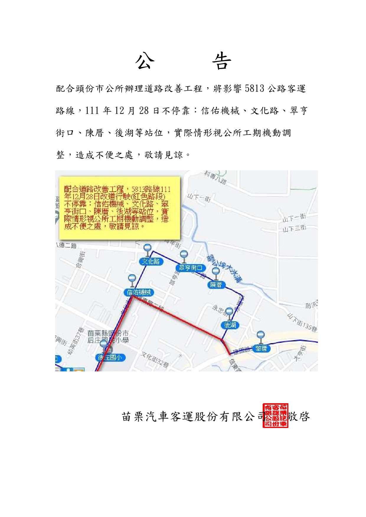 為配合道路改善工程,12/28本公司5813路線改道行駛