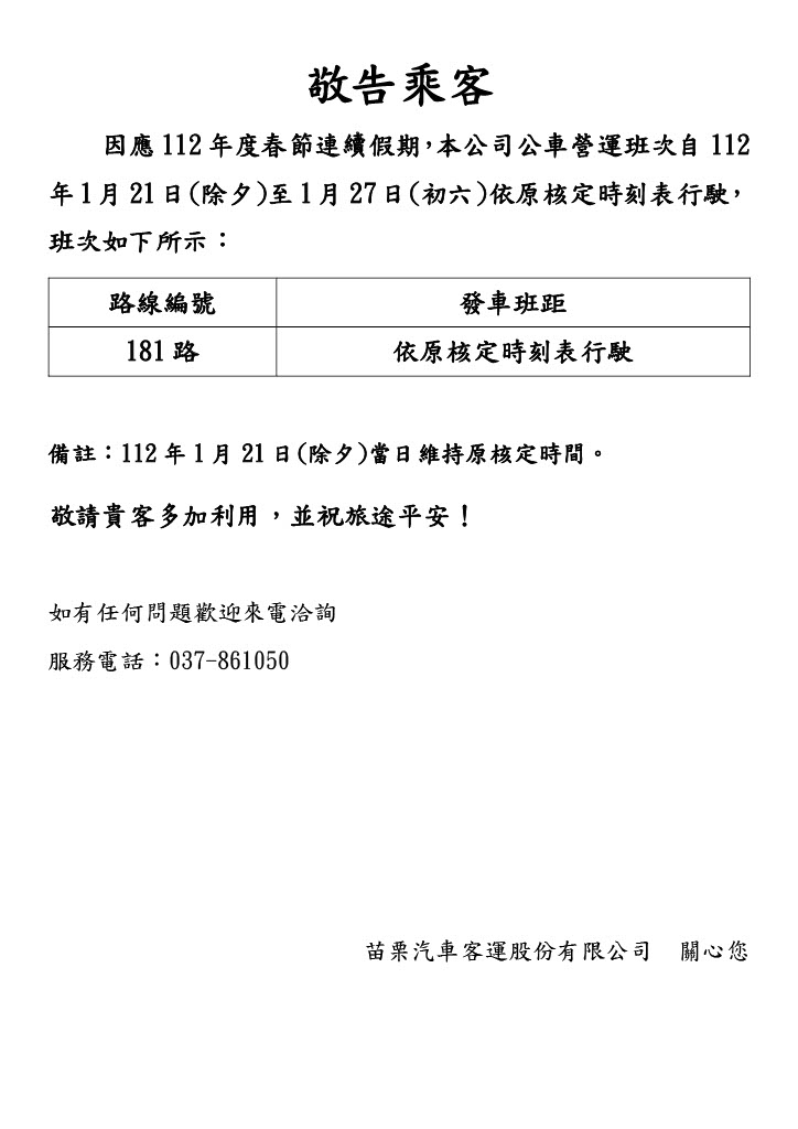 112年度【台中市區公車-181】春節班次公告
