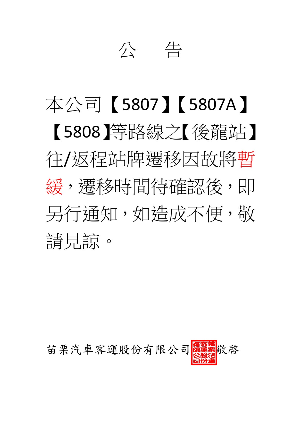 本公司5807等路線【後龍站】往/返程站牌遷移因故將暫緩