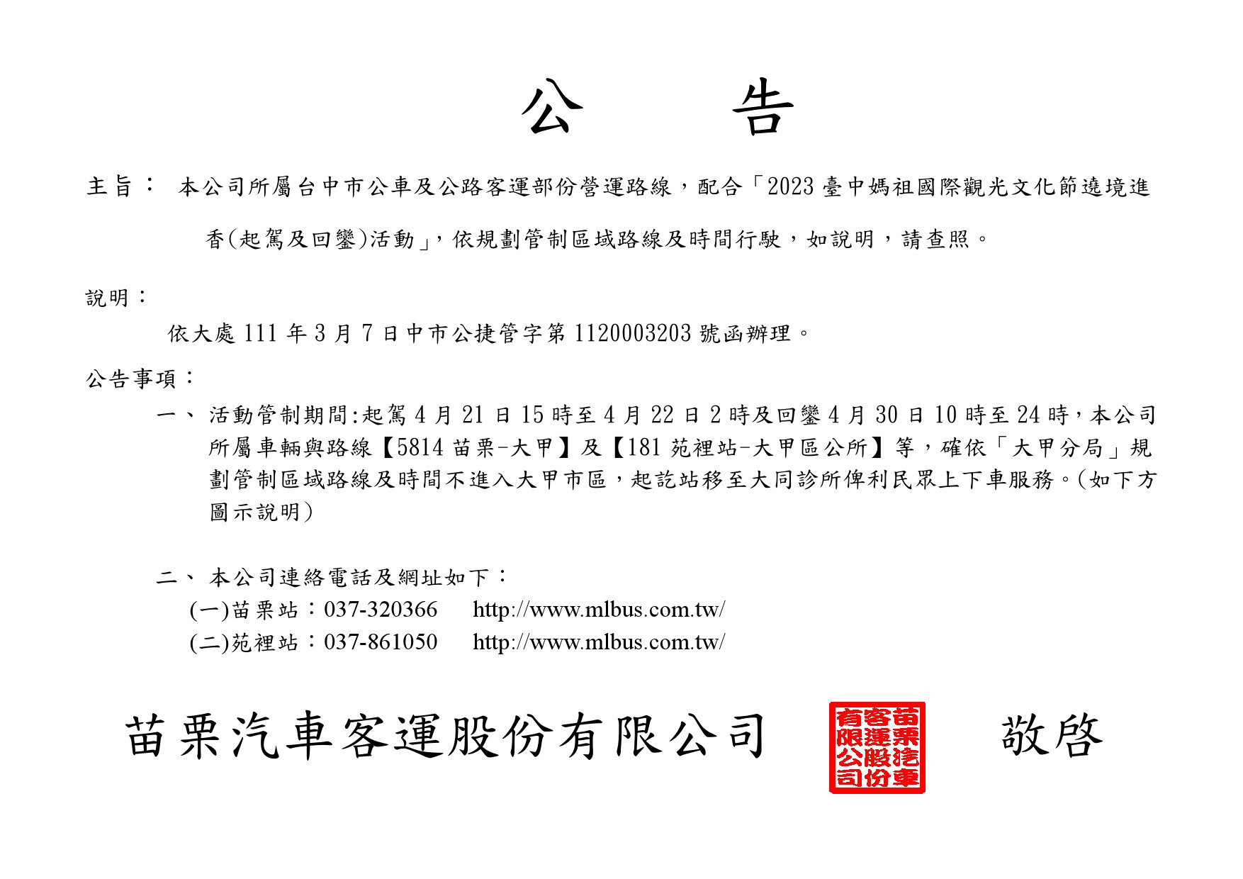 【2023年臺中媽祖國際觀光文化節遶境進香活動】路線調整通知
