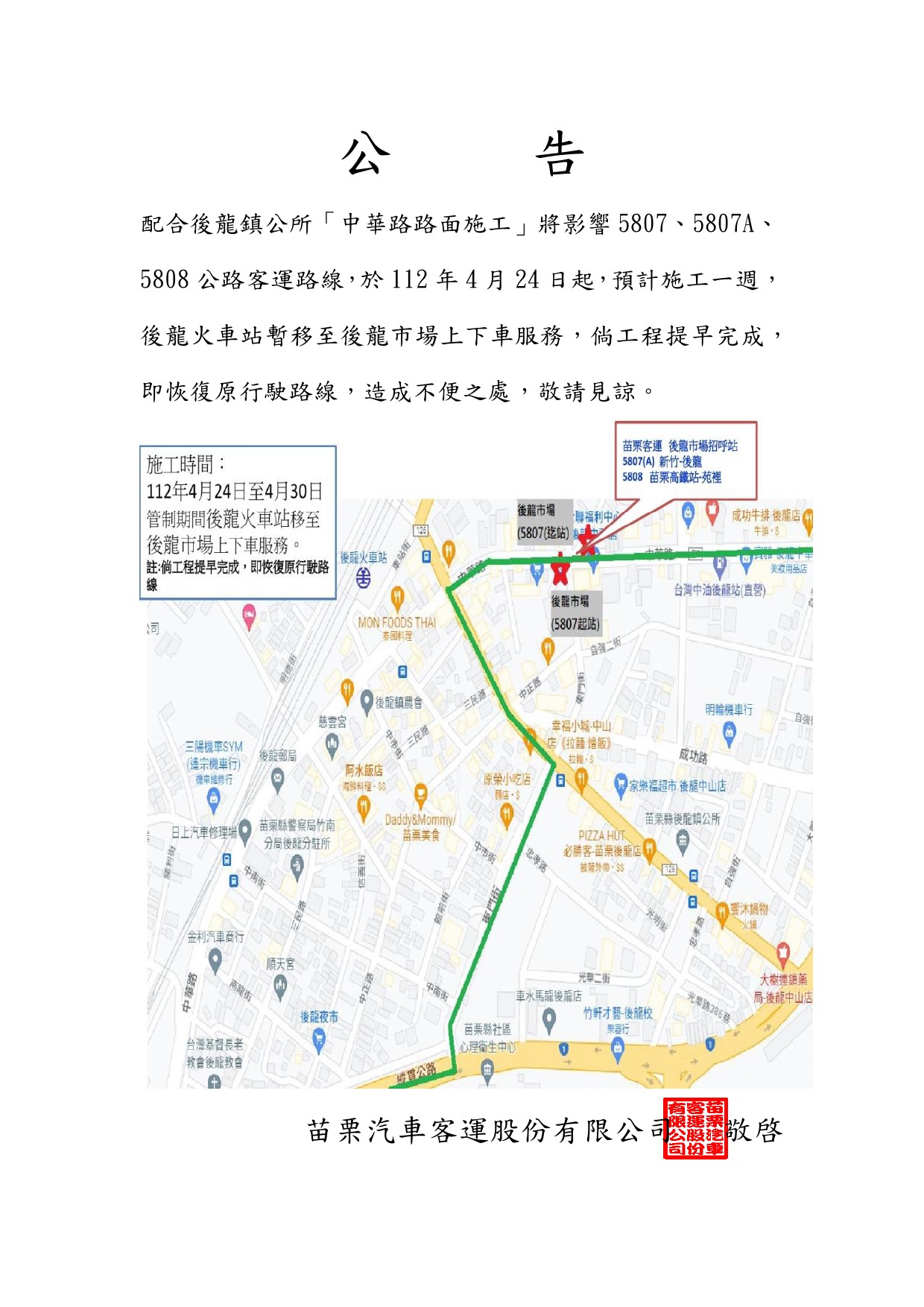 【後龍鎮中華路路面施工】5807.5808等路線調整通知