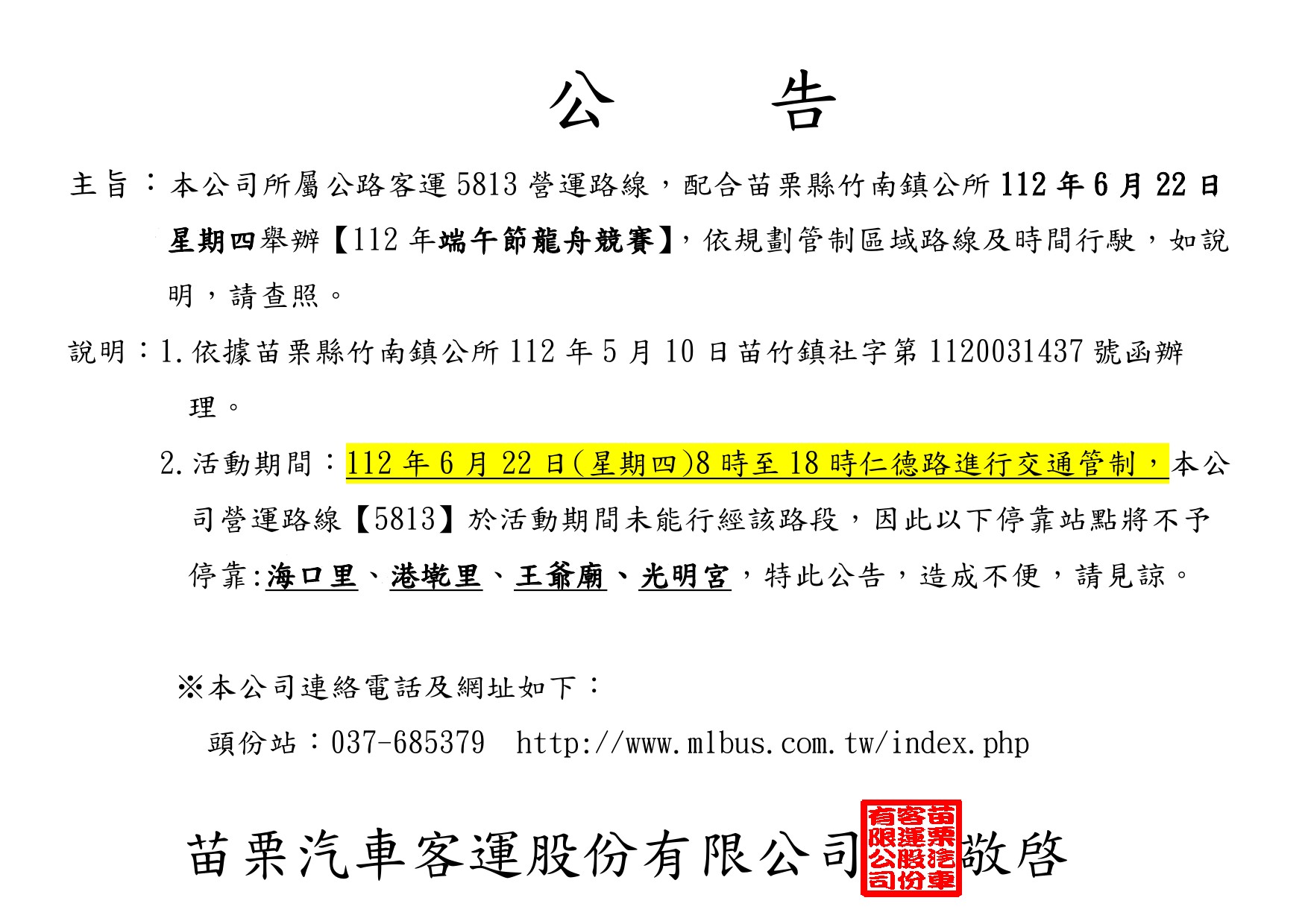 配合竹南【112年端午節龍舟競賽】,班車站位影響公告