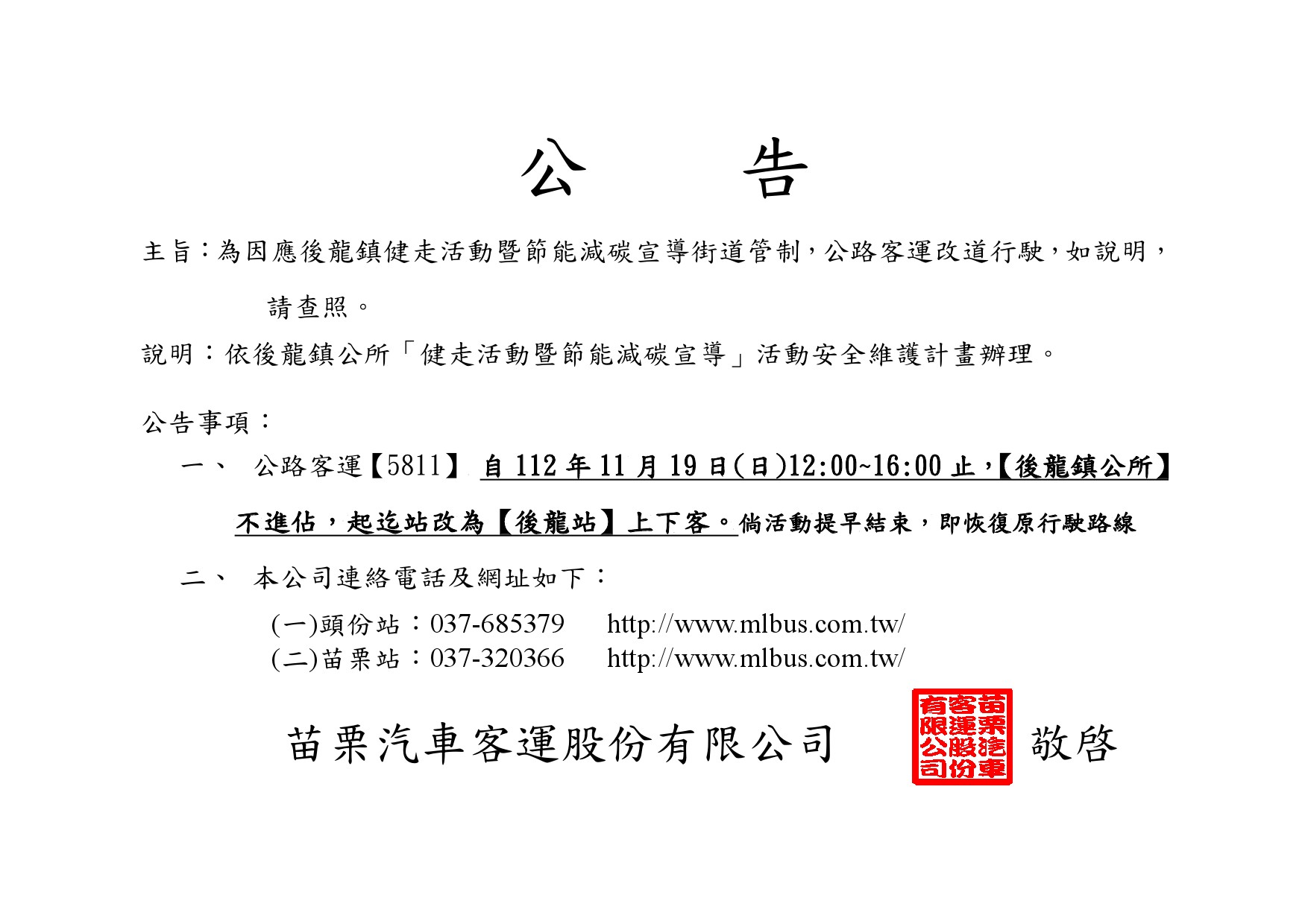 112年11月19日12時至16時,【後龍鎮公所】不進站