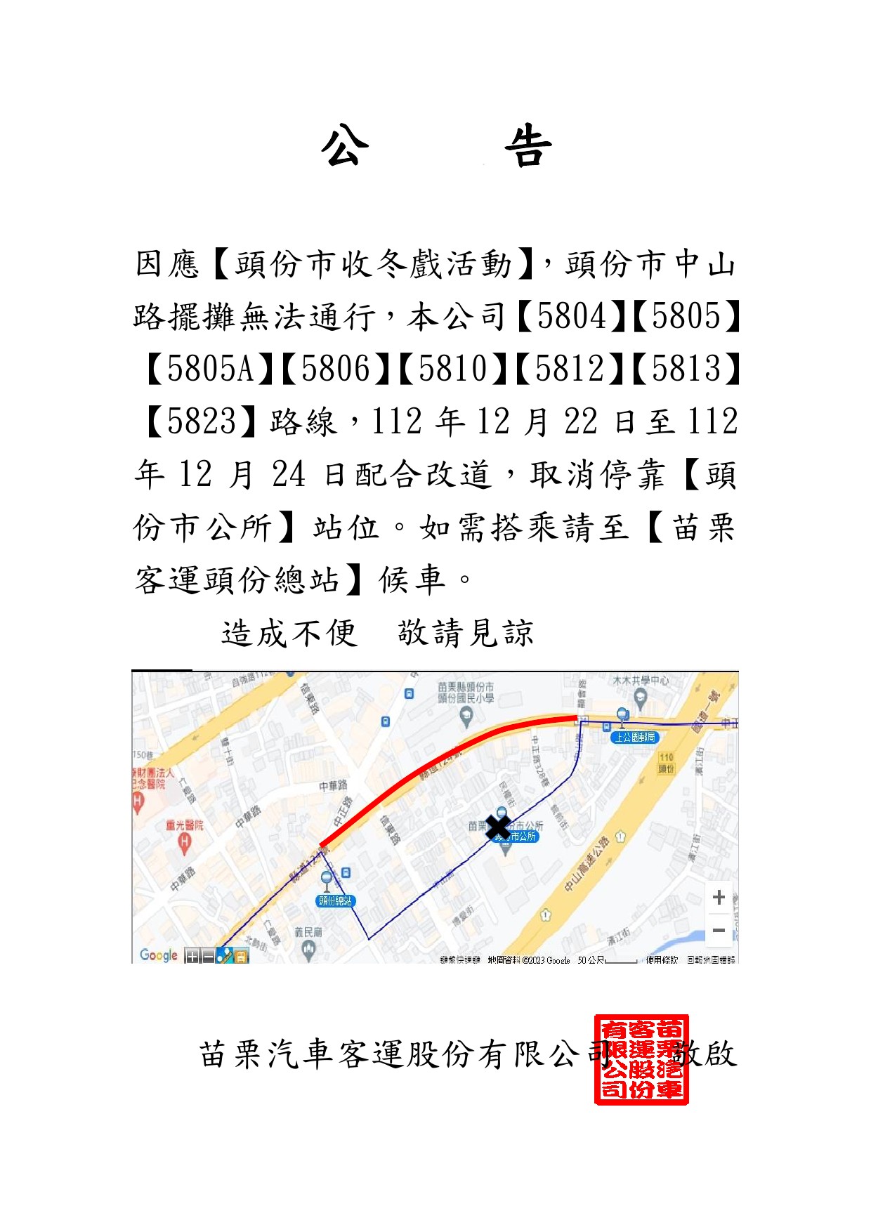 「2023頭份收冬戲」班車改道公告