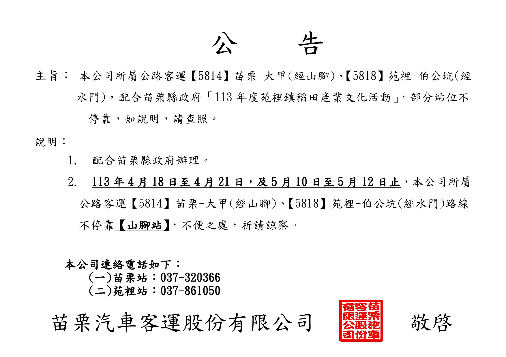 本公司5814.5818路線不停靠【山腳站】日期請參閱公告