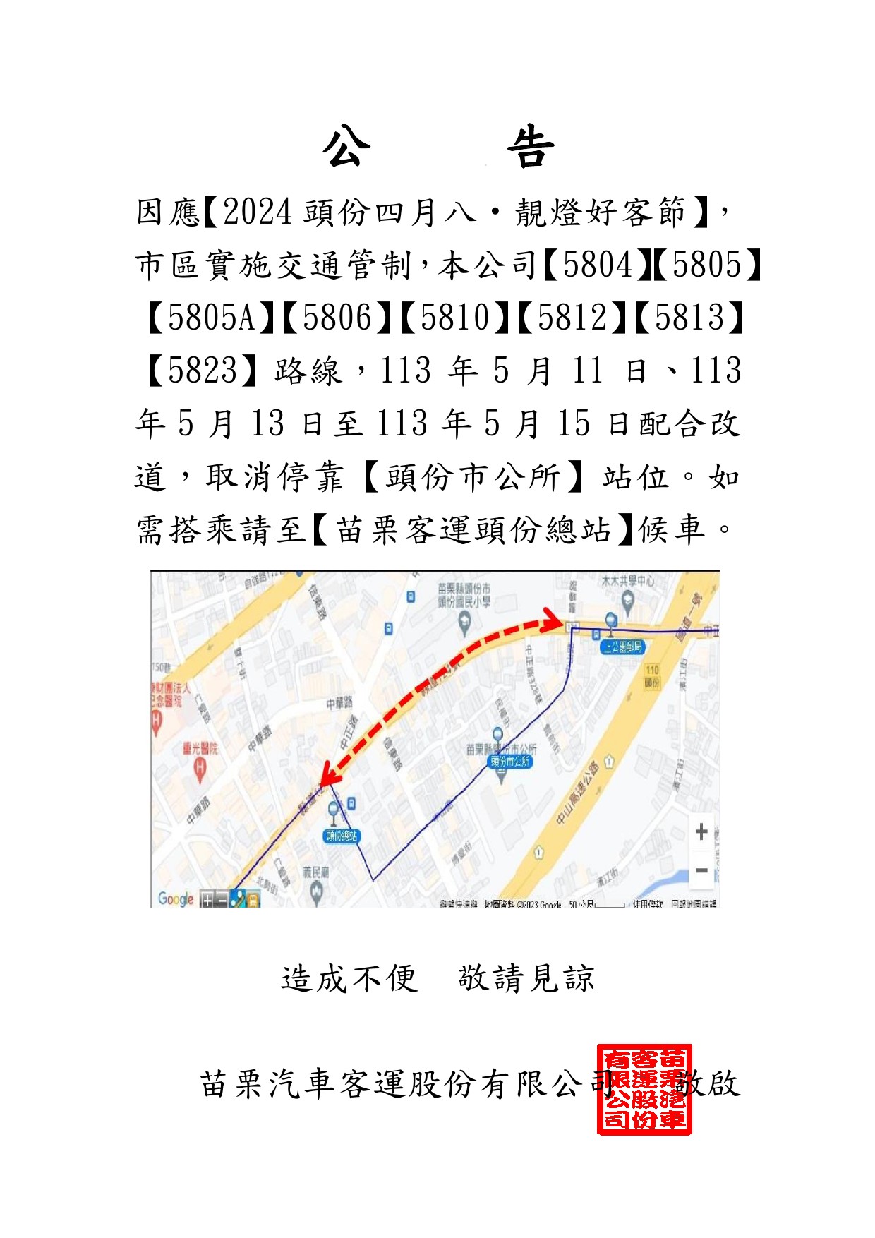 「2024頭份四月八‧靚燈好客節」班車改道公告