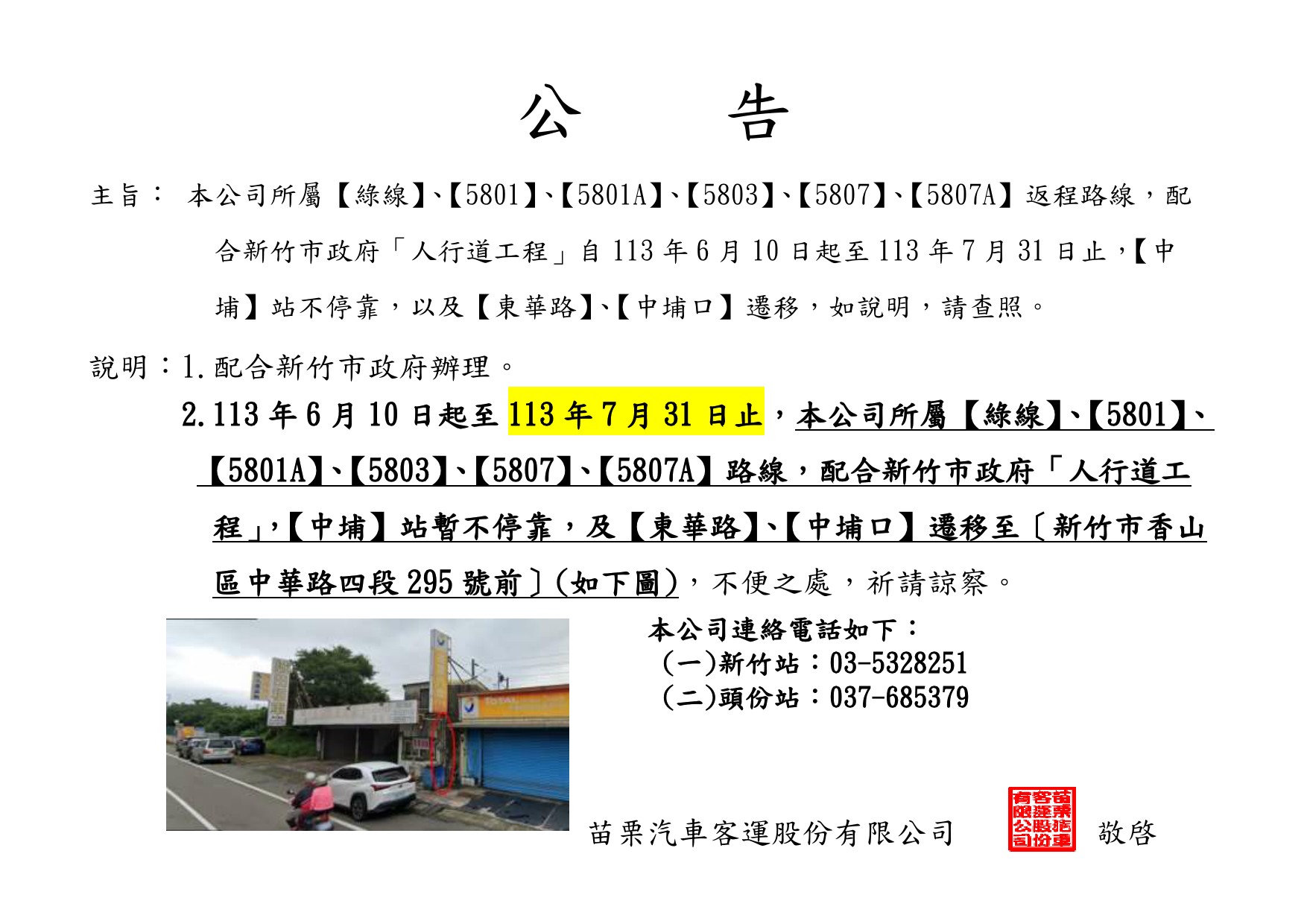 配合新竹市政府人行道工程,中埔站暫不停靠及東華路、中埔口遷移