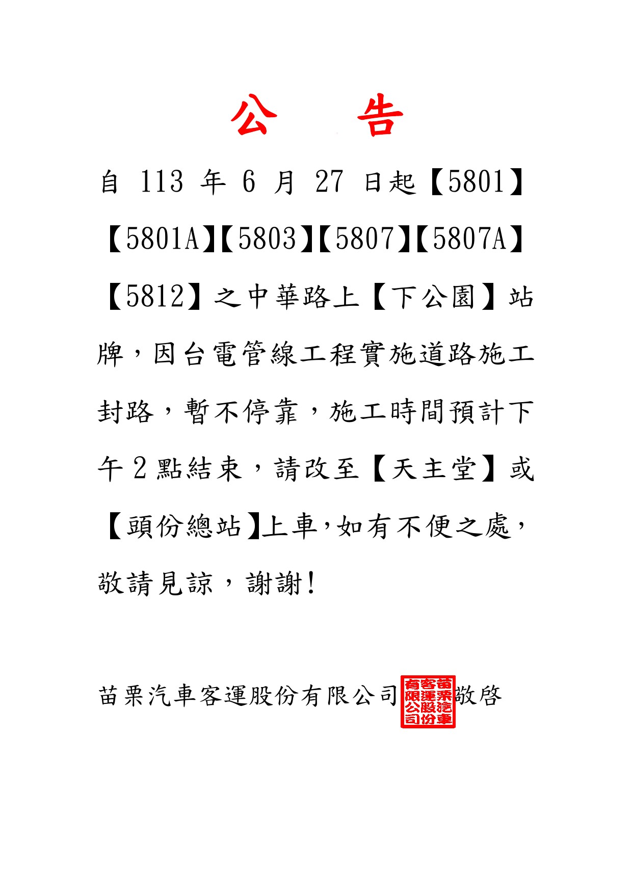 113年6月27日起【下公園】站實施道路施工封路,暫不停靠
