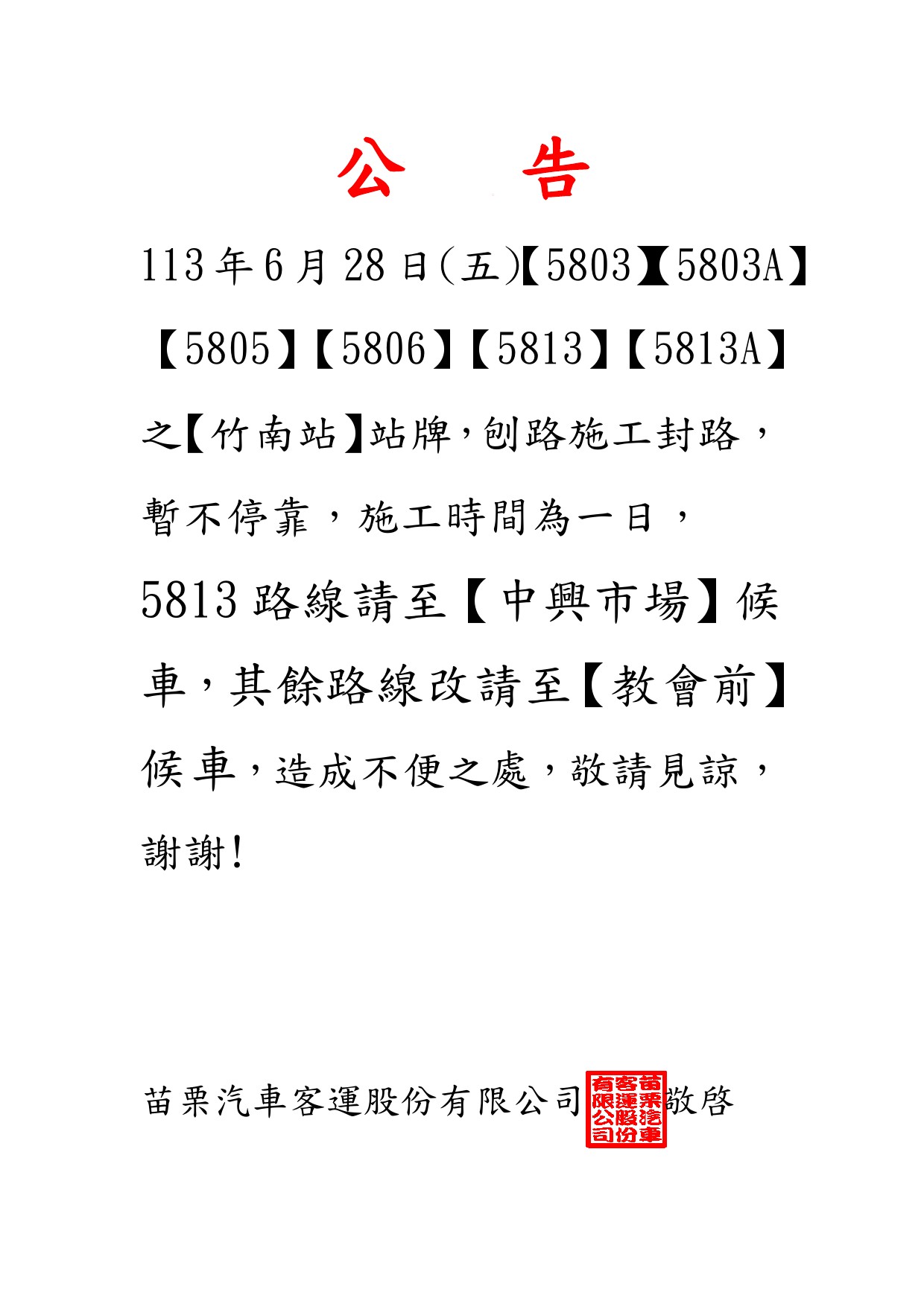113年6月28日【竹南站】實施道路施工封路,暫不停靠