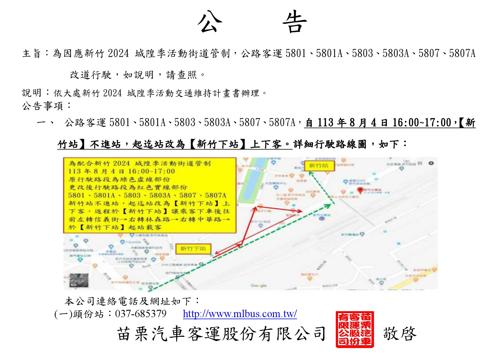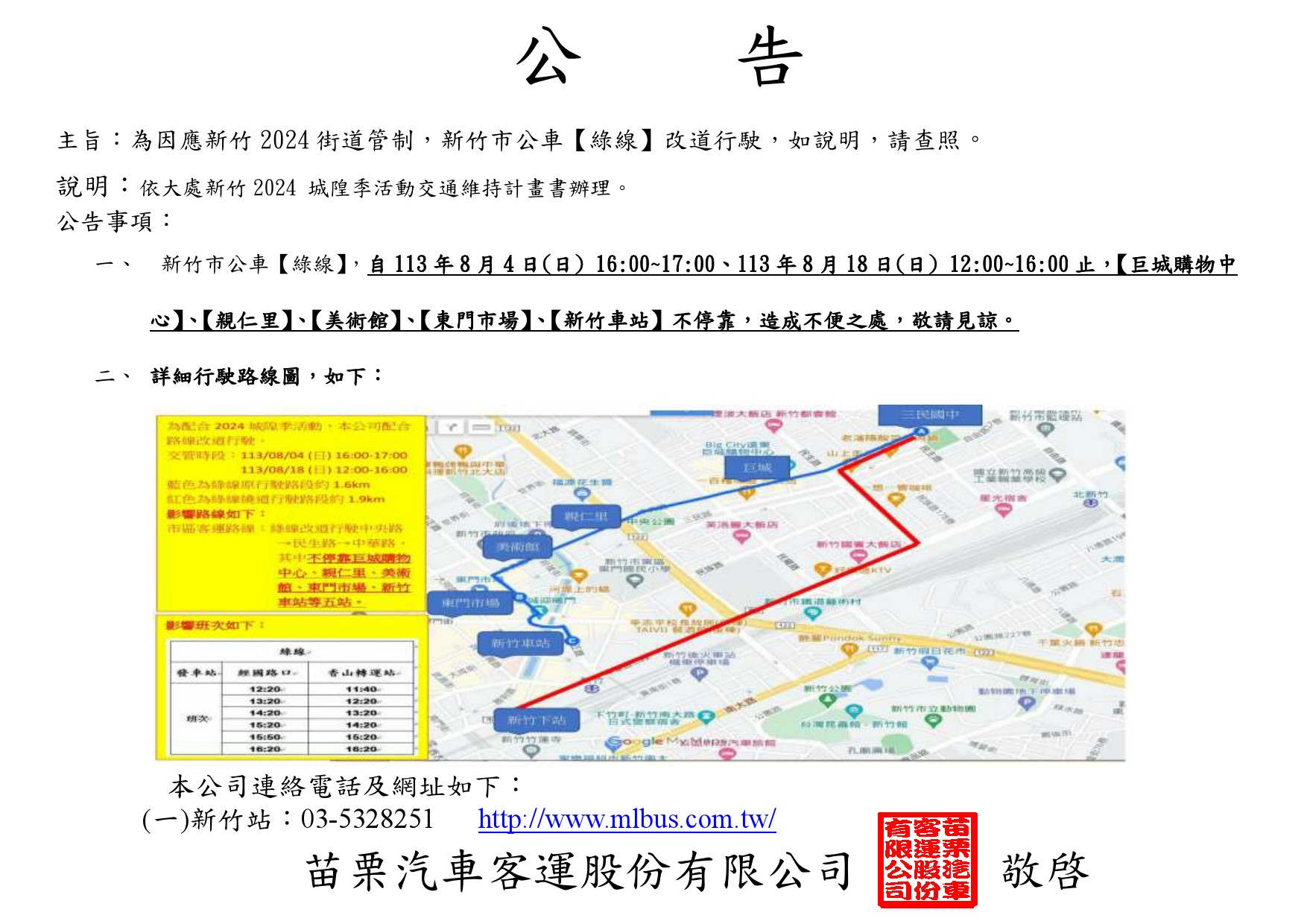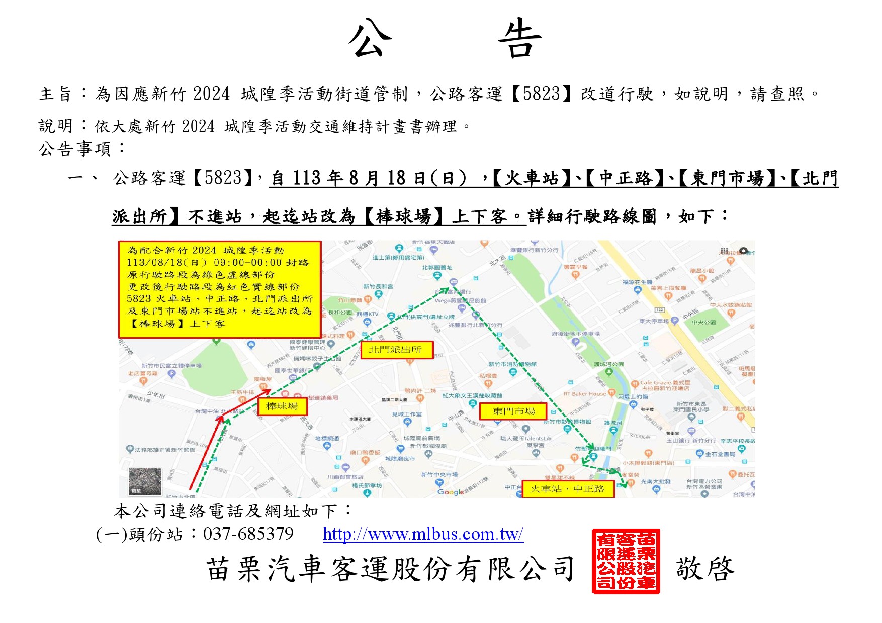 新竹2024 城隍祭【綠線】、公路客運【5823】等調整路線