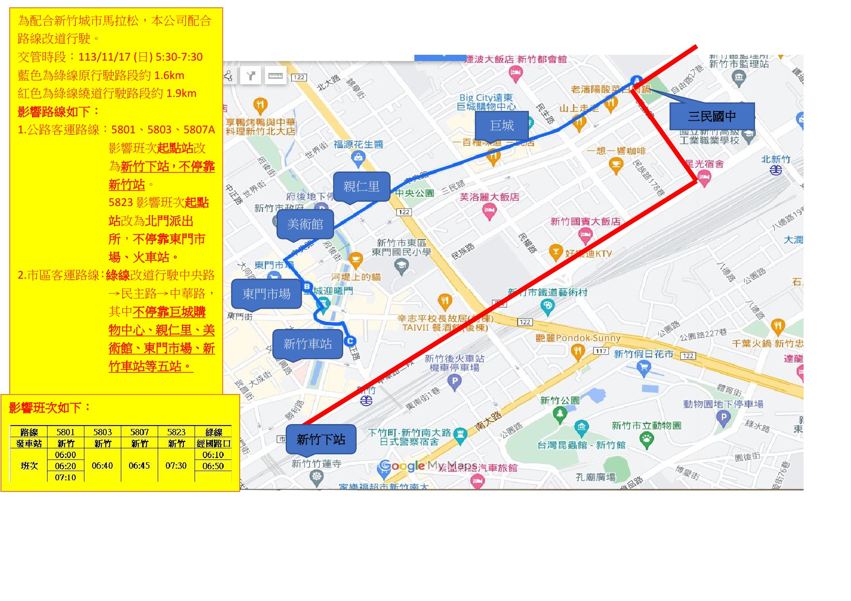 為配合新竹城市馬拉松,本公司配合路線改道行駛。