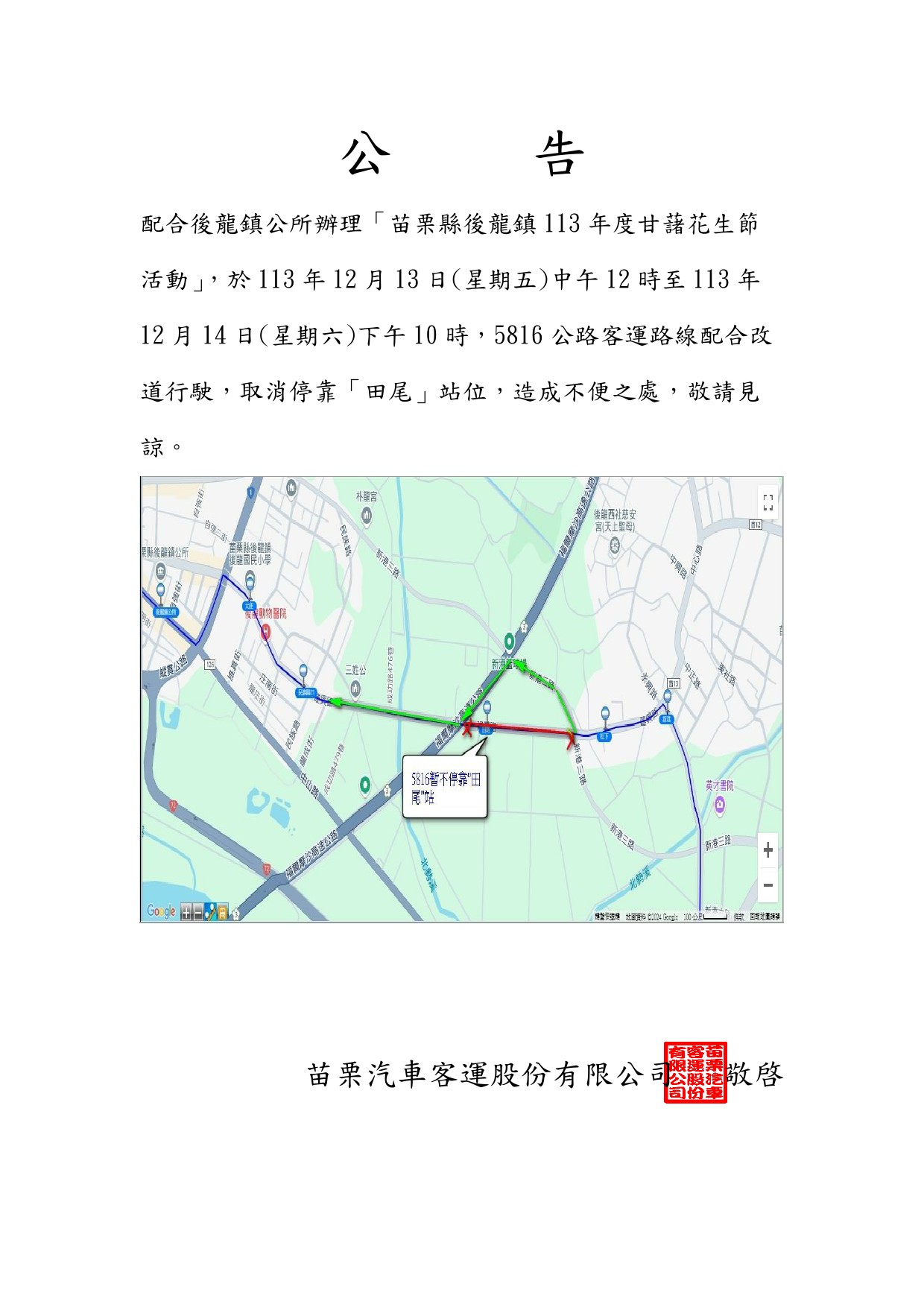 【苗栗縣後龍鎮113年度甘藷花生節活動】5816路線調整通知