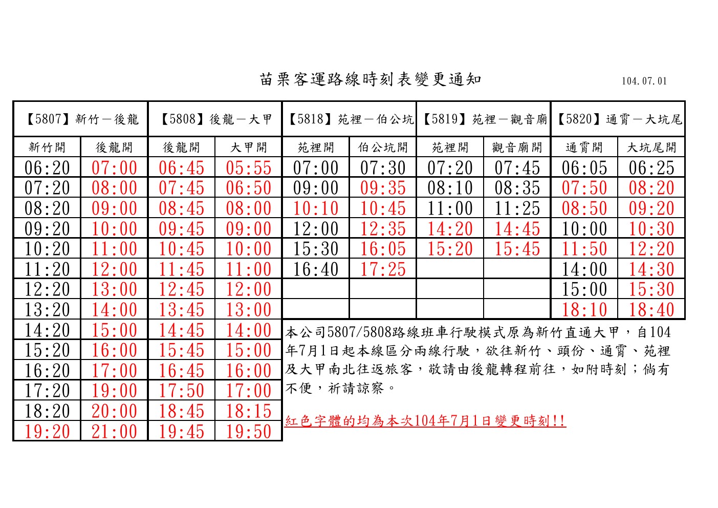 本公司訂於104年7月1日起,依公路客運核定路線之規定將5807/5808路線分段行駛,請乘客見諒。