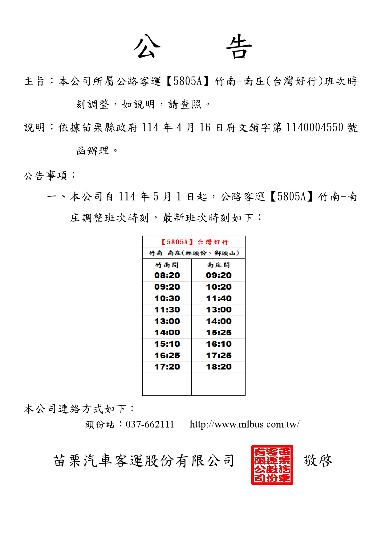 【5805A】台灣好行路線114年5月1日起班次時刻調整