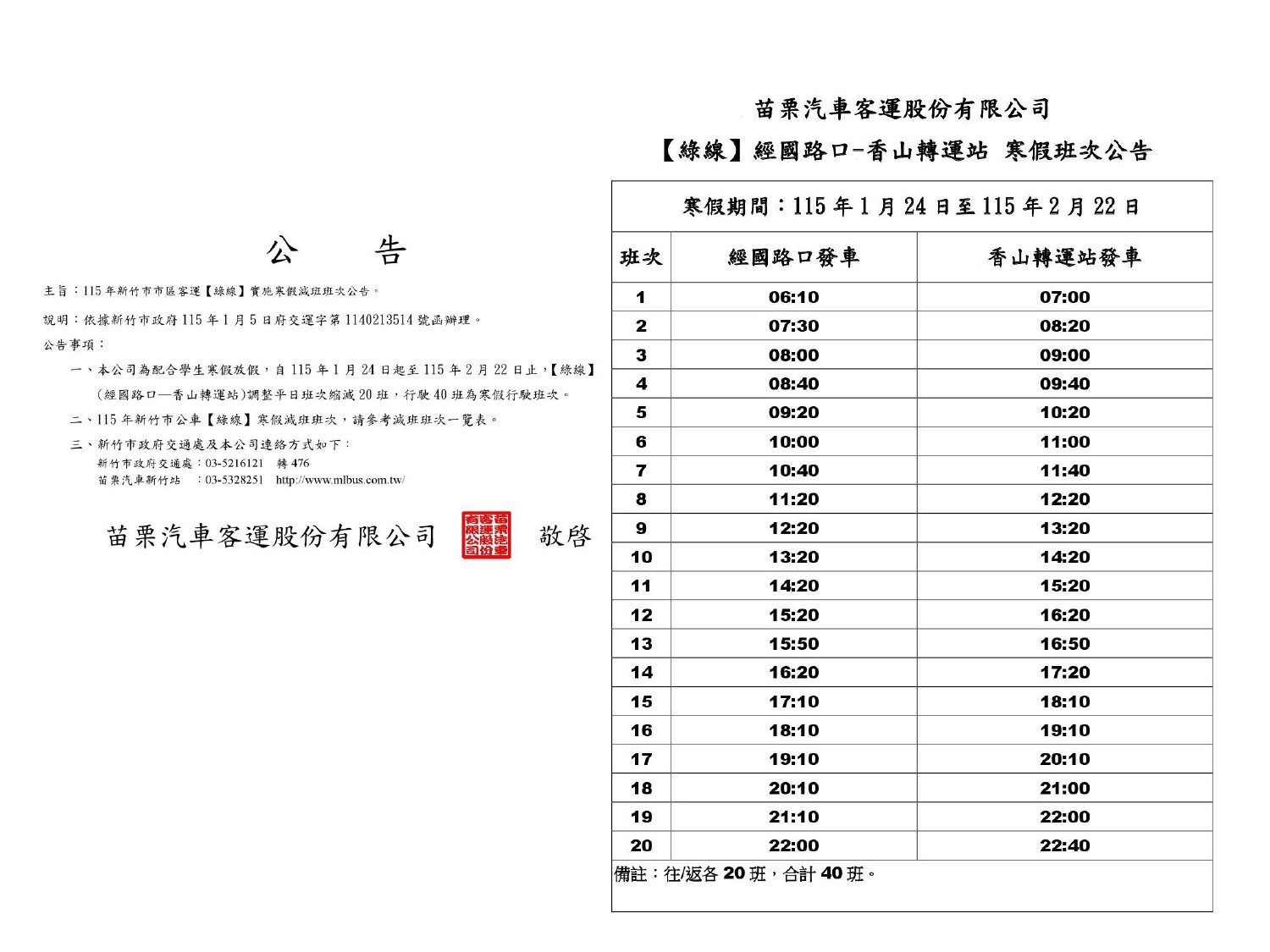 115年度【新竹市區公車綠線】寒假調整班次時刻公告